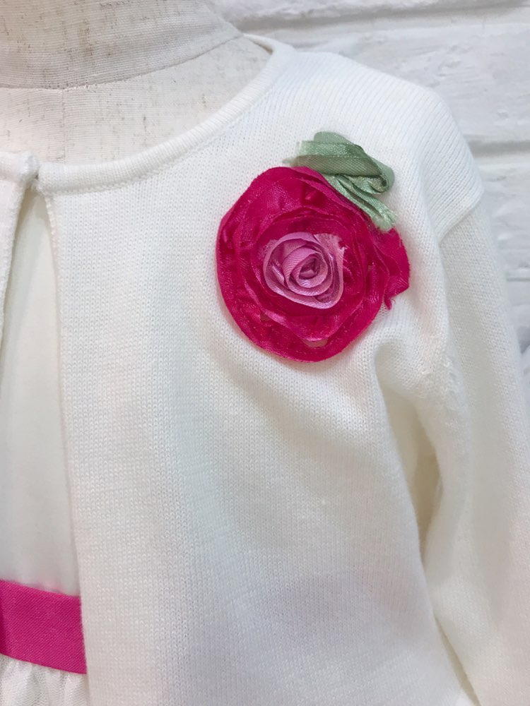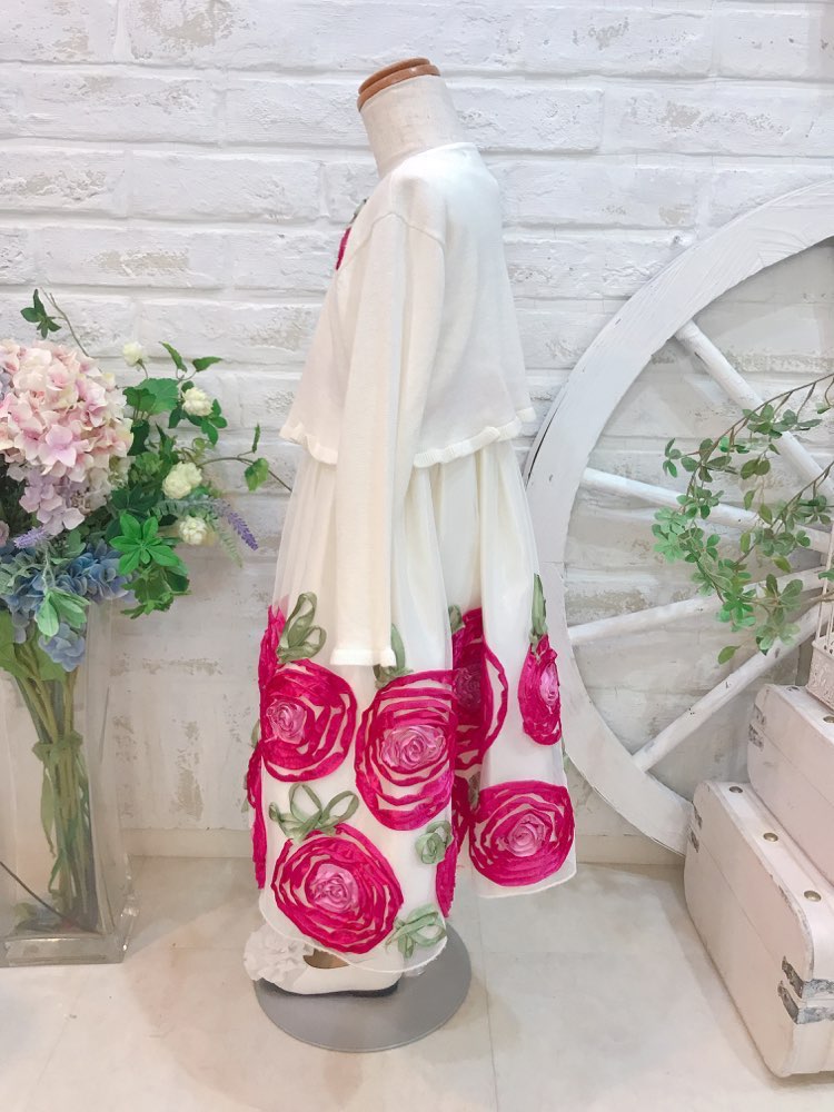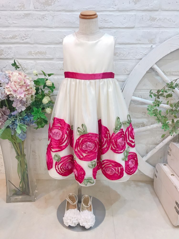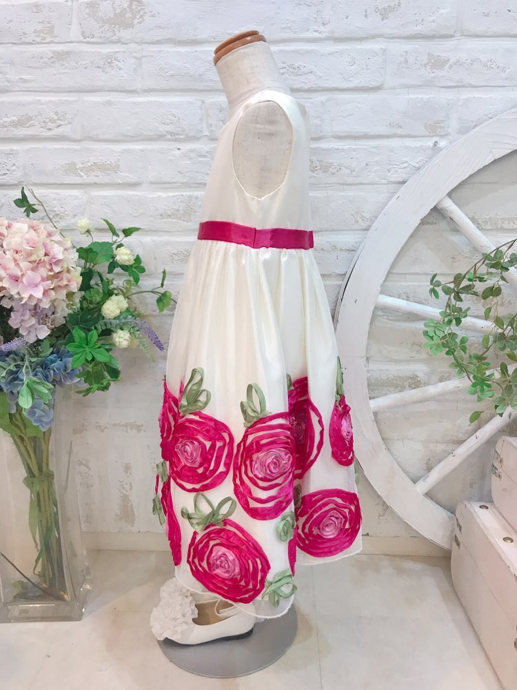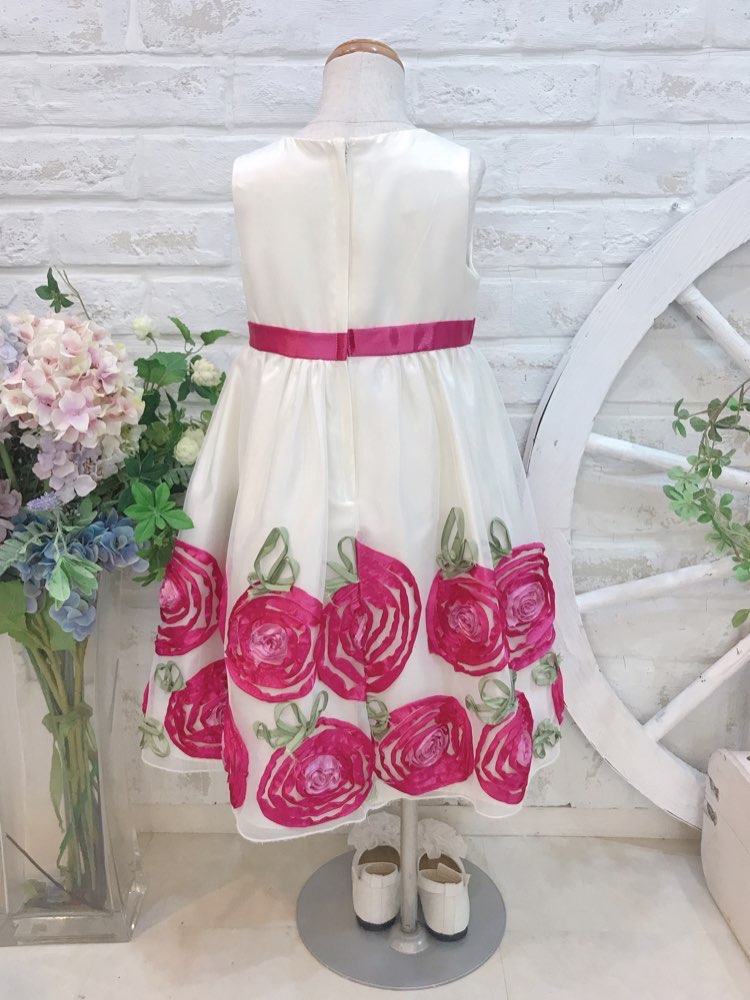 前身頃にたっぷりとバラモチーフがあしらわれた子供用フォーマルドレス。スカート部分はシャンタン。控えめで上品な光沢感があります。スカートの裏地のすそにはハードチュールが縫い付けてあるので、 パニエなしでもふんわりとハリのあるシルエットに。 結婚式のおよばれ、リングガール・フラワーガールの衣装、ピアノやヴァイオリンの発表会・演奏会・コンクール、七五三どのシーンにもぴったりの1着です。