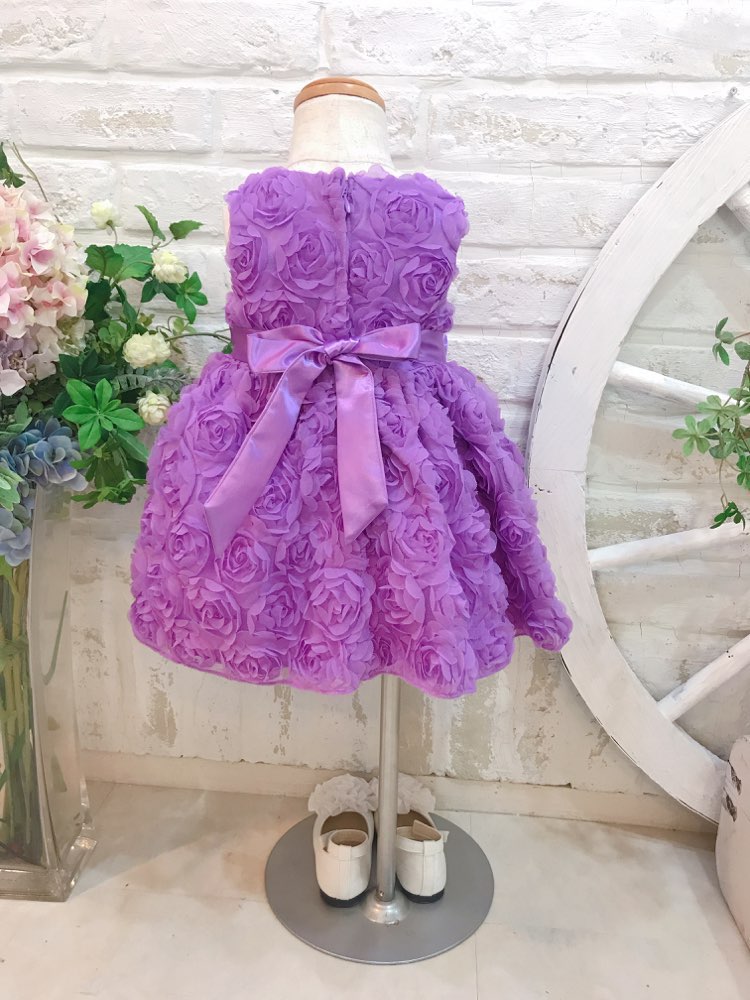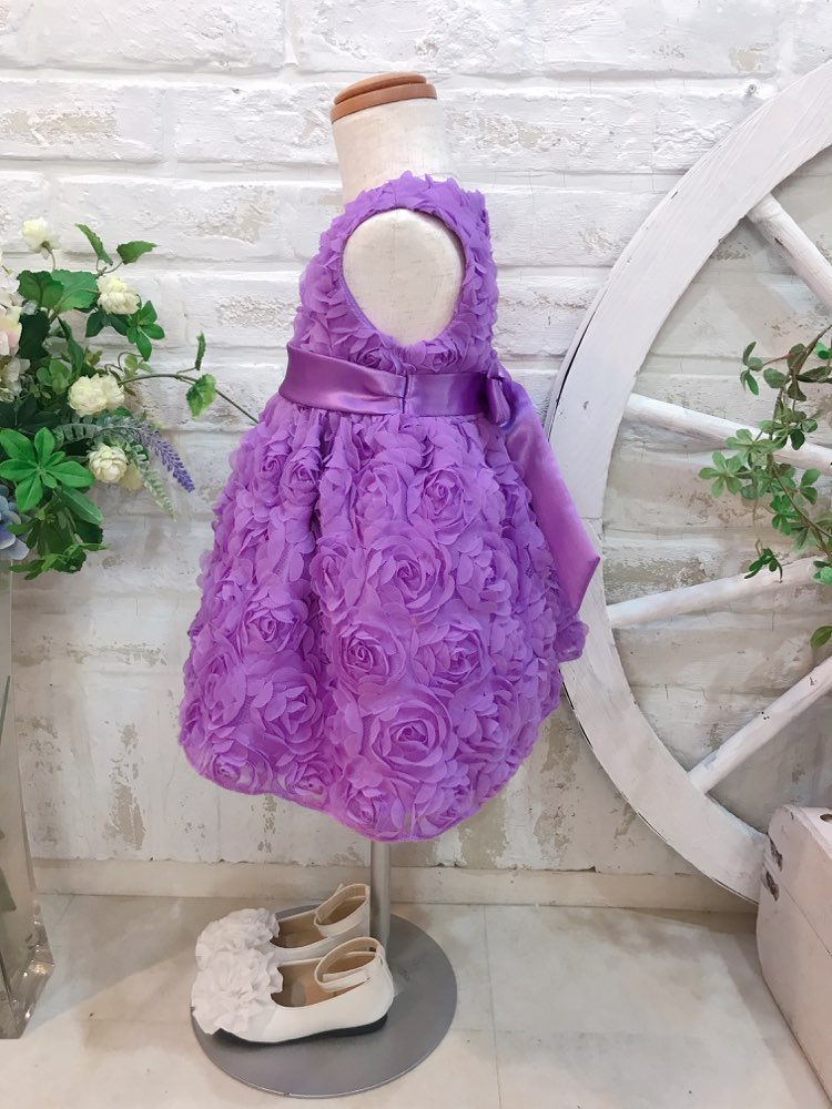 当店で大人気の一着!バラをたくさんあしらったような素材が華やかなキッズドレスです。ウェストのサテンリボンがアクセントになっていて可愛いデザイン♪大人っぽいパープルは、大人のドレス共相性抜群♪ ピアノ発表会・結婚式・フラワーガールなどのフォーマルシーンにぜひ♪
