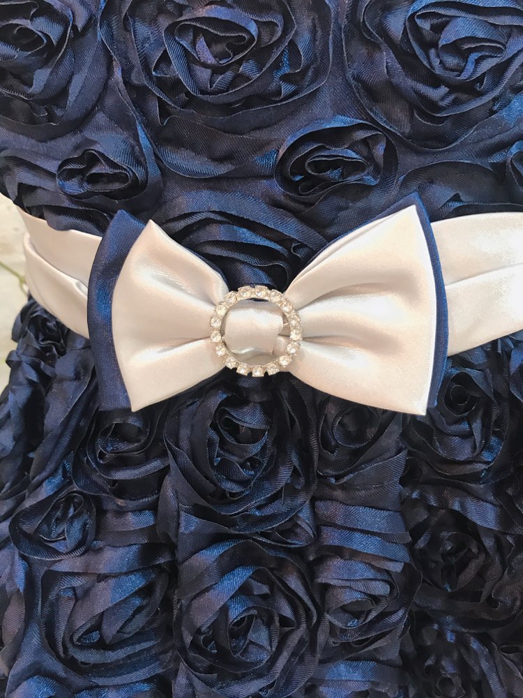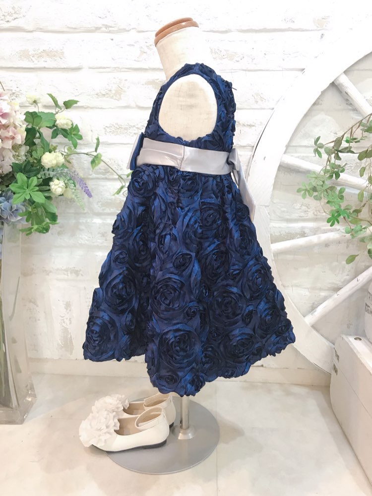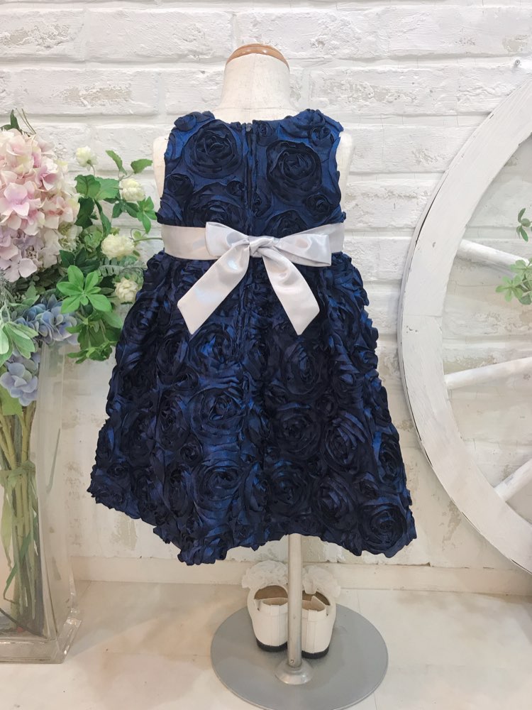 ネイビーの全体的に立体的なお花のいっぱい付いたとっても可愛いドレスです。可愛いのにお色味がネイビーなので甘くなりすぎず、ブルー系が好きなお子様におすすめです♪ウェストのサテン生地のライトグレーのリボンに、シルバーのストーンが付いていて、アクセントになっていて可愛いさ倍増! ピアノやヴァイオリンの発表会・演奏会・コンクール、結婚式のおよばれ、フラワーガール・リングガールの衣装、七五三やお誕生日の写真撮影、パーティーどのシーンにもぴったりの1着です。