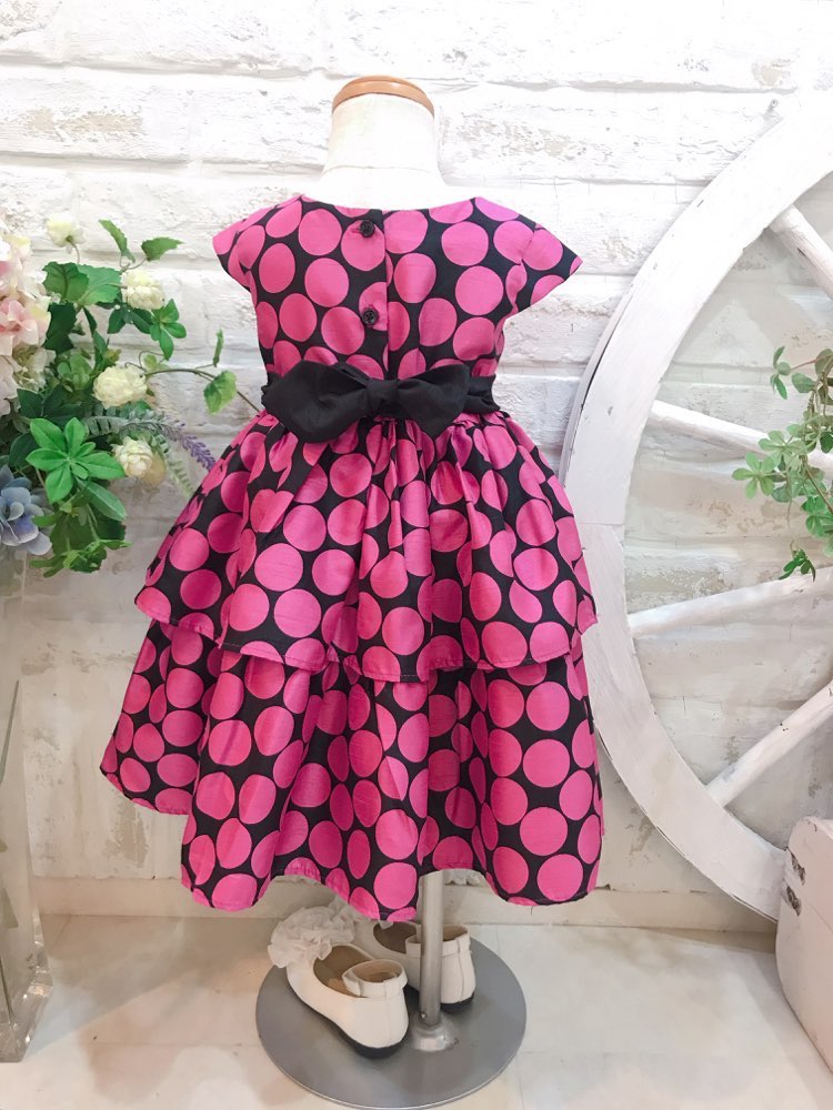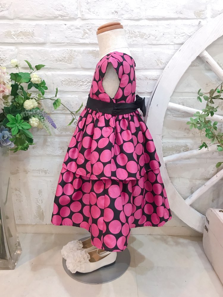 結婚式、発表会、演奏会、七五三などの特別な日に、オススメなドレスです。 デザインにビビットピンクのドットのドレスは、大人っぽい。 キッながらもふんわりとしたスカートが子供らしくズドレス可愛いです。ウェスト切り替えのブラックリボンがアクセントになっていて可愛いポイントです♪
