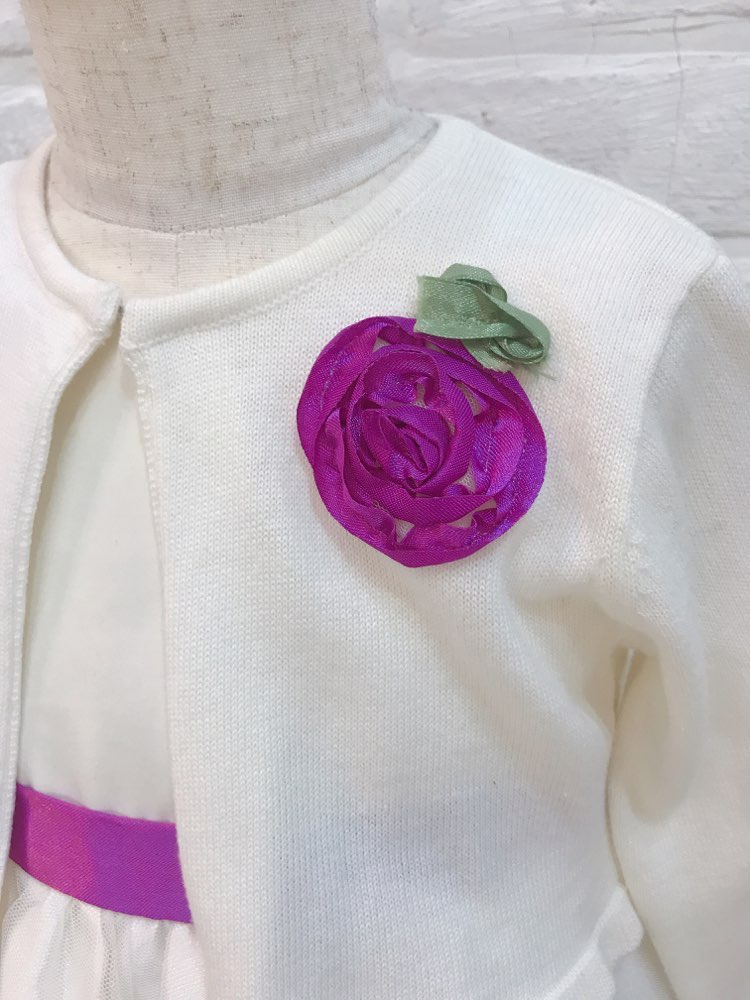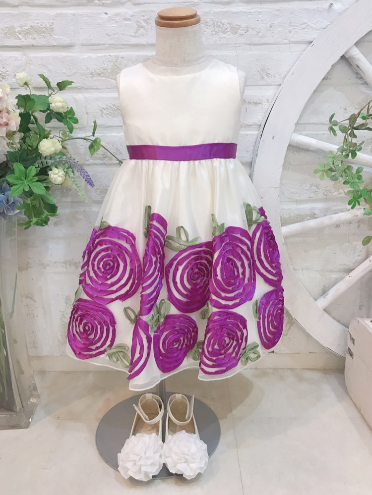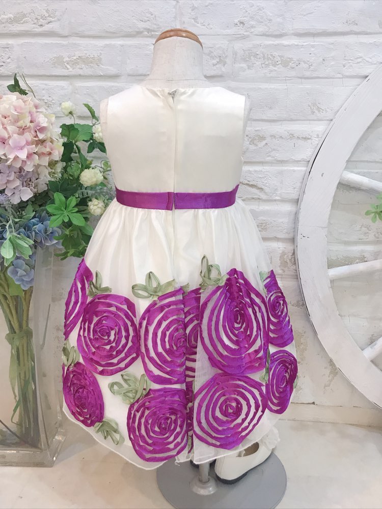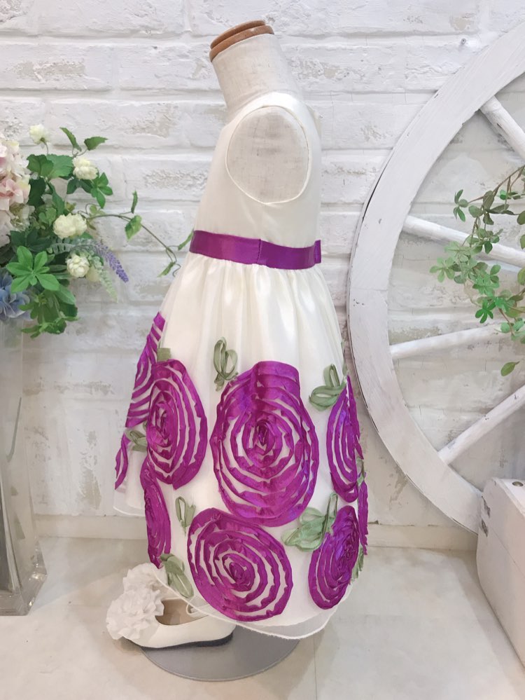 前身頃にたっぷりとバラモチーフがあしらわれた子供用フォーマルドレス。スカート部分はシャンタン。控えめで上品な光沢感があります。スカートの裏地のすそにはハードチュールが縫い付けてあるので、 パニエなしでもふんわりとハリのあるシルエットに。 結婚式のおよばれ、リングガール・フラワーガールの衣装、ピアノやヴァイオリンの発表会・演奏会・コンクール、七五三どのシーンにもぴったりの1着です。