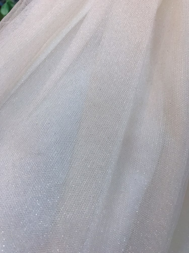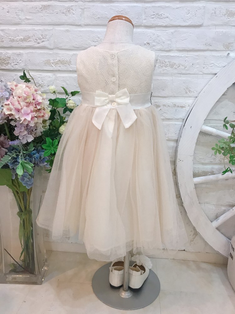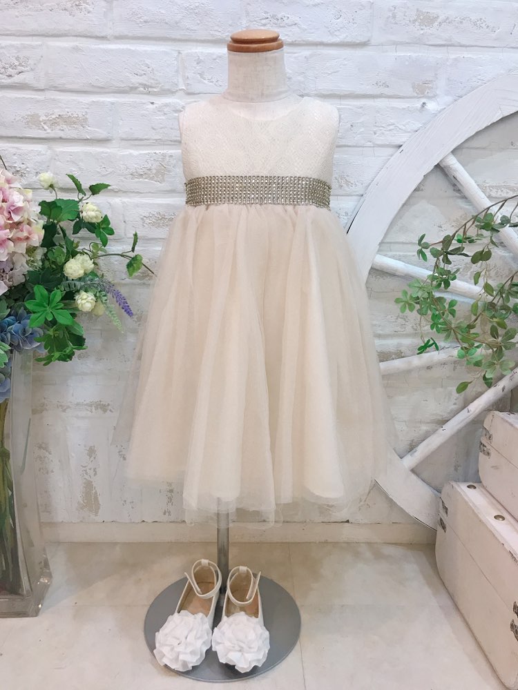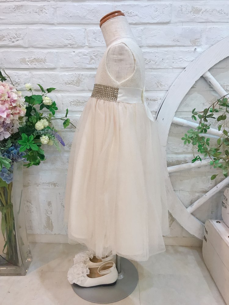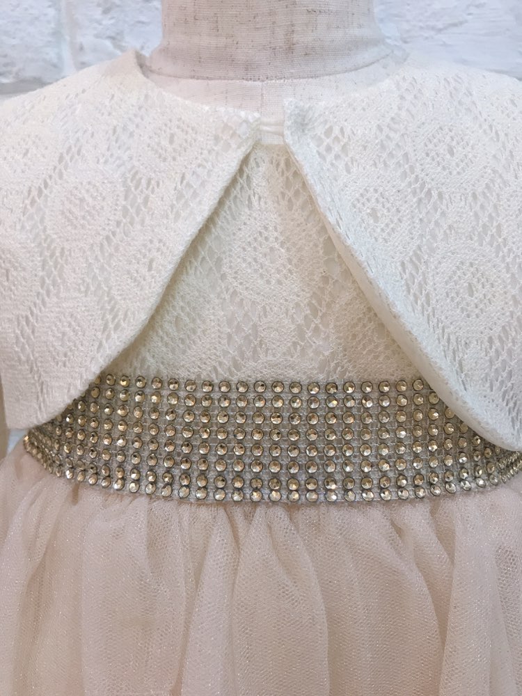当店で人気のキッズドレス。まっ白ではない、柔らかい印象のオフホワイトカラーはお子様にとってもおすすめなドレス!シンプル過ぎず、スカート部分はキラキラとグリッターが入っているので、動く度にとっても華やかです。ウェストには、ベージュのストーンがベルトのように並んでいるためお腹周りもすっきり♪上半身はレース素材で、その素材と一緒のレースボレロが付いているので、秋冬、夏場でもクーラーのついた室内でサッと着れるのでおすすめです♪結婚式のおよばれ、リングガール・フラワーガールの衣装、ピアノやヴァイオリンの発表会・演奏会・コンクール、七五三どのシーンにもぴったりの1着です。