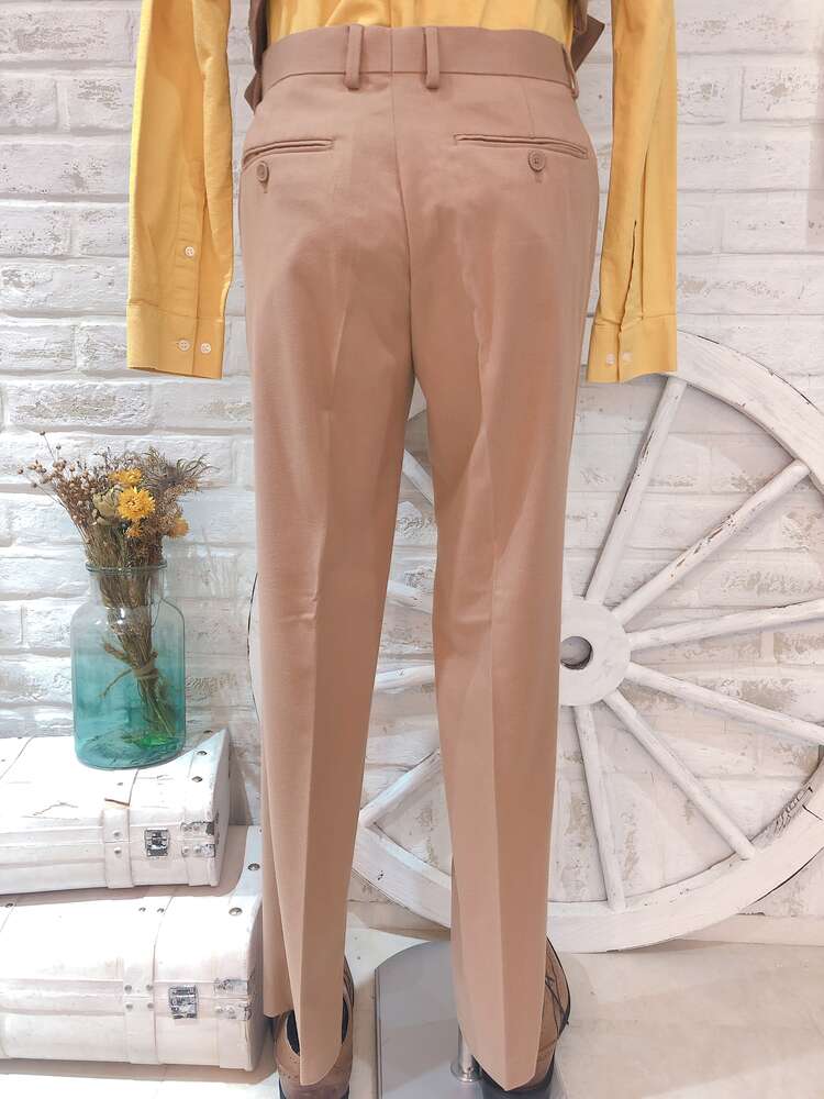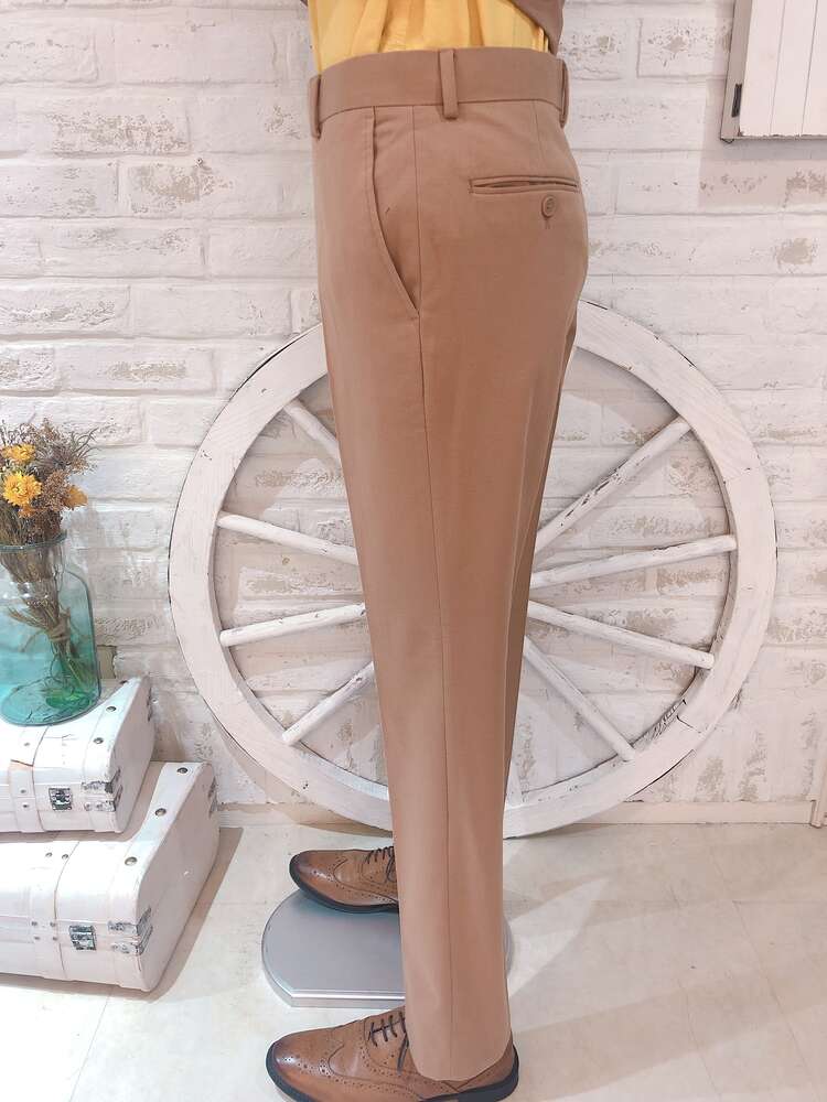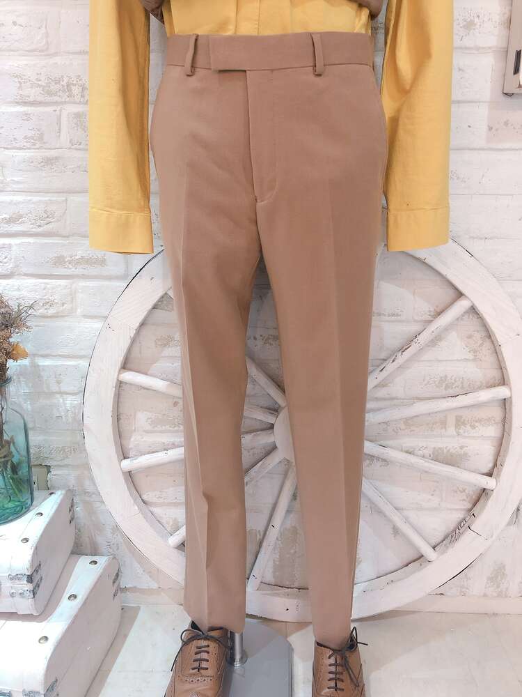 ナチュラルで柔らかな雰囲気のキャメルパンツ。普段Sサイズ~Mサイズを着用されている方におすすめです。無地なので使い勝手が良く、春夏だと花柄や明るめのシャツやタイ、秋冬だとボルドーなど濃いめのお小物と合わせると季節感を意識したお洒落なスタイリングに。セットのジャケット、ベストと合わせてガーデンウェディングやフォトウエディング、海外挙式、パーティなど幅広いシーンにお使い頂ける一着です。