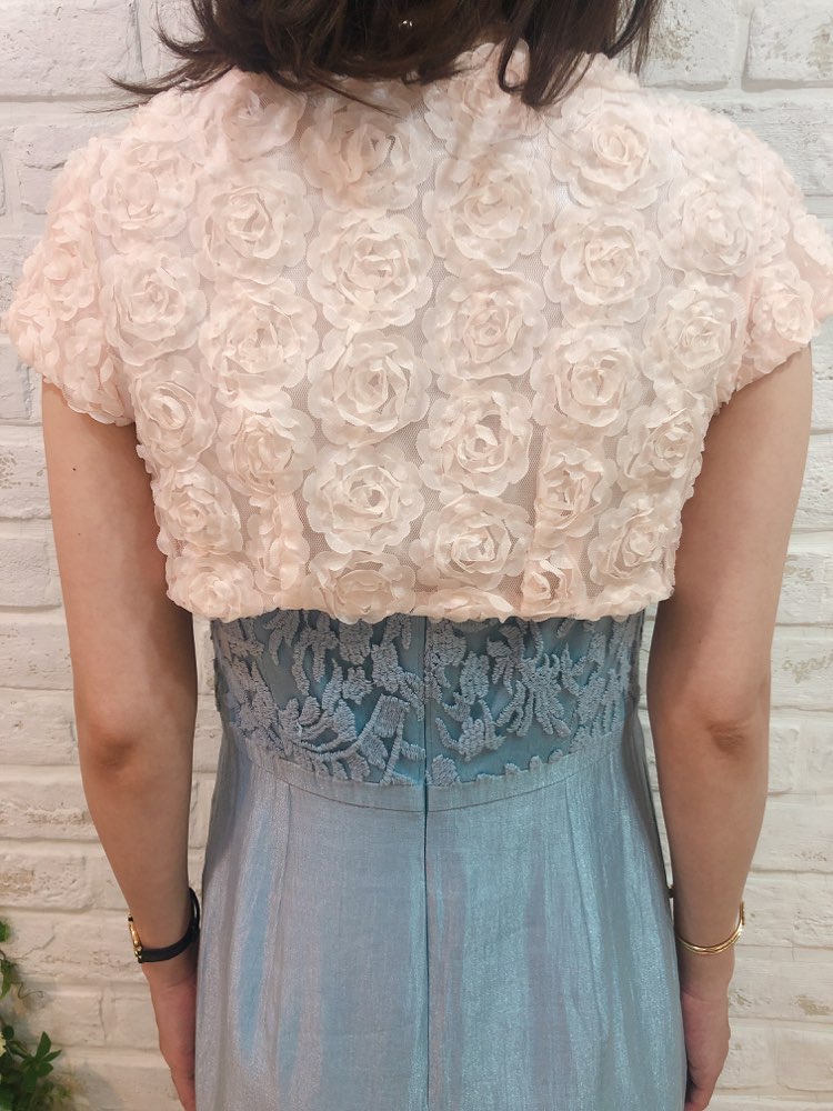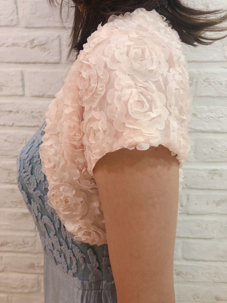 立体的な薄いピンクのバラが特徴のボレロです全面にバラが入っておりとても華やかで女性らしい魅力を引き出してくれます。幅広いシーンやドレスにも相性抜群です。 ※生地は、お呼ばれボレロでは一般的なシフォン素材です。