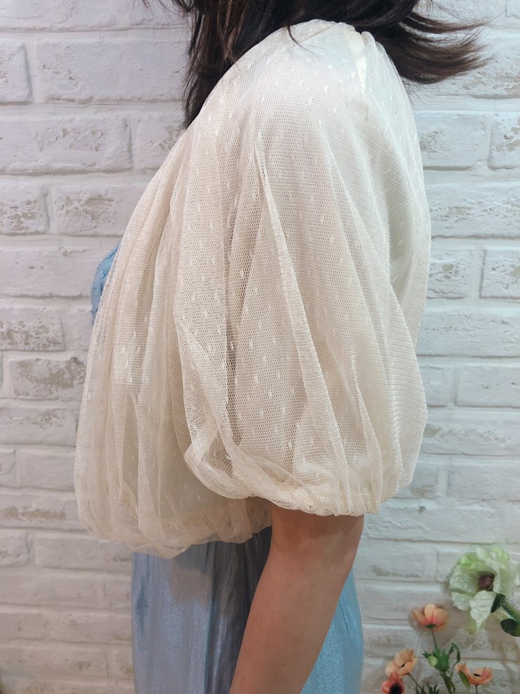 全面オーガンジー素材で、ふんわりとした印象のホワイトボレロです。パフスリーブ袖がふんわりとエアリーな印象に仕上げ、女性らしい魅力を引き出してくれ、二の腕カバーにも一役買ってくれます。女性らしいデザインが沢山盛り込まれてはいますが、可愛くなり過ぎないのは、ホワイトカラーと軽やかな生地感のおかげ♪幅広いシーンやドレスにも相性抜群です。