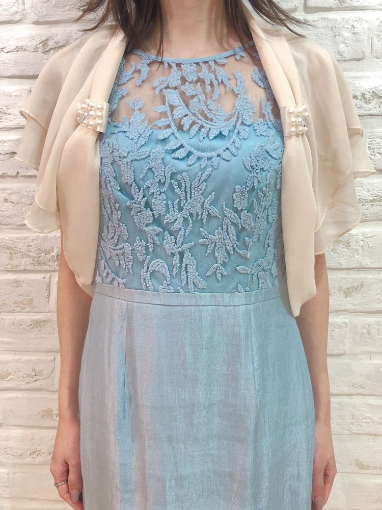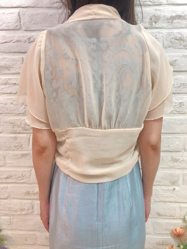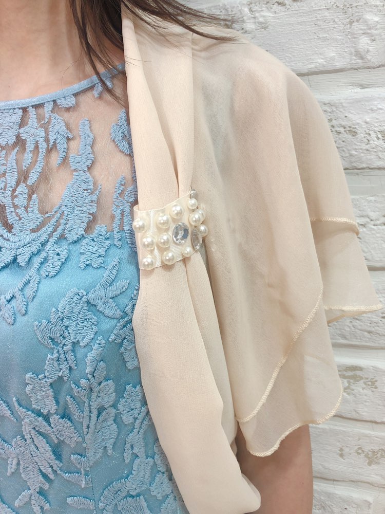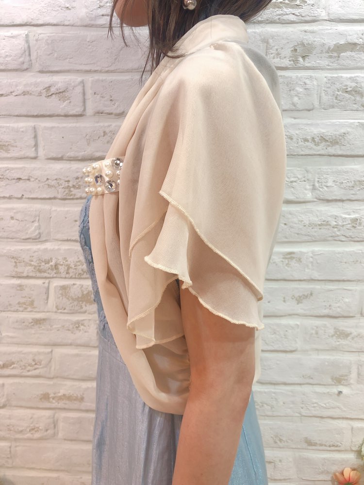 薄手のシンプルなデザインで、スッキリとした印象のベージュボレロです。フレア袖がふんわりとエアリーな印象に仕上げ、女性らしい魅力を引き出してくれ、二の腕カバーにも一役買ってくれます。シンプルですが、胸元に大粒パールとビジュが付いており華やかな装いにもぴったりの一品。 女性らしいデザインが沢山盛り込まれてはいますが、可愛くなり過ぎないのは、ベージュカラーと軽やかな生地感のおかげ♪ 幅広いシーンやドレスにも相性抜群です。