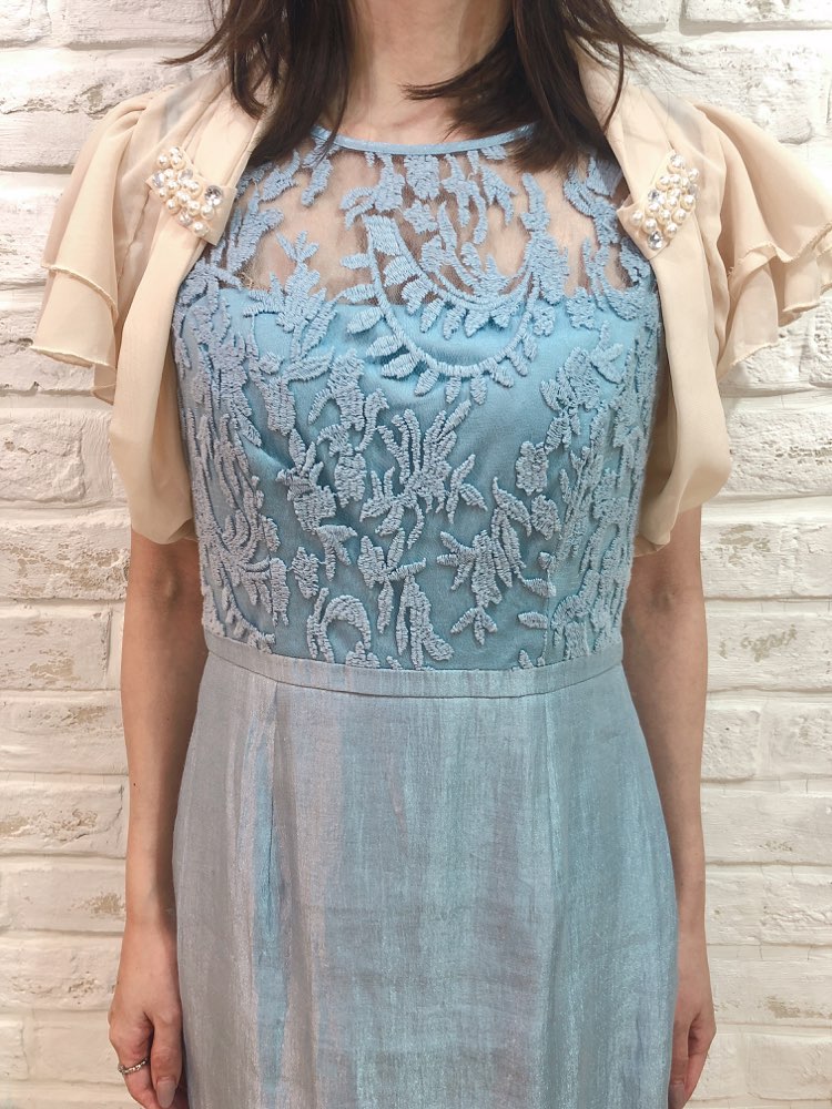 薄手のシンプルなデザインで、スッキリとした印象のベージュボレロです。フレア袖がふんわりとエアリーな印象に仕上げ、女性らしい魅力を引き出してくれ、二の腕カバーにも一役買ってくれます。シンプルですが、胸元に大粒パールとビジュが付いており華やかな装いにもぴったりの一品。