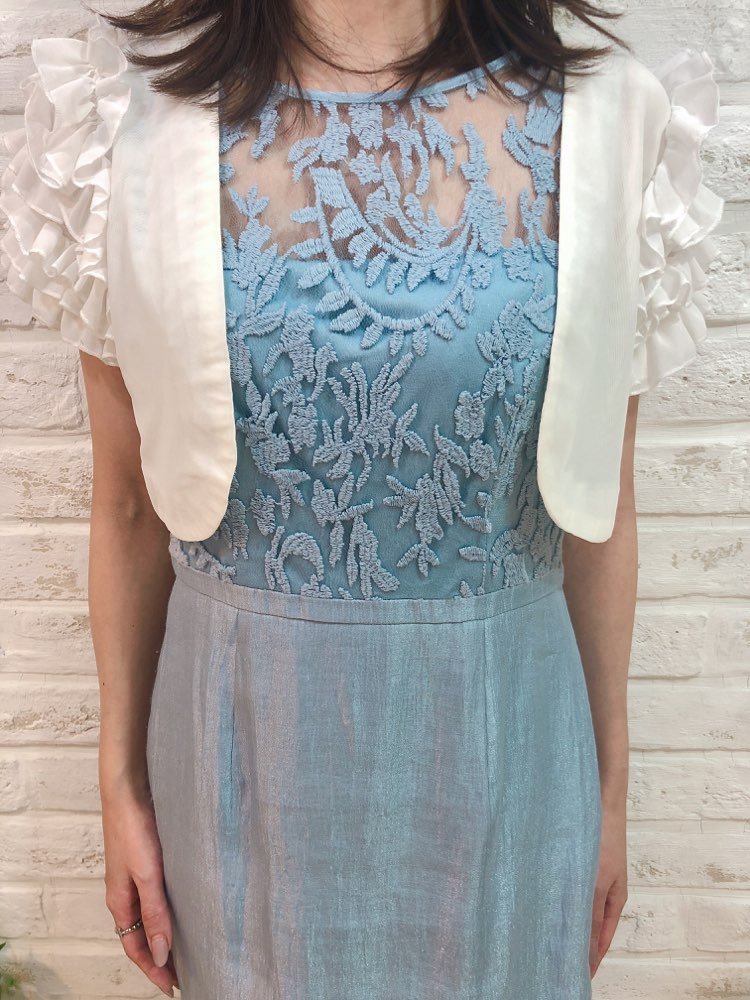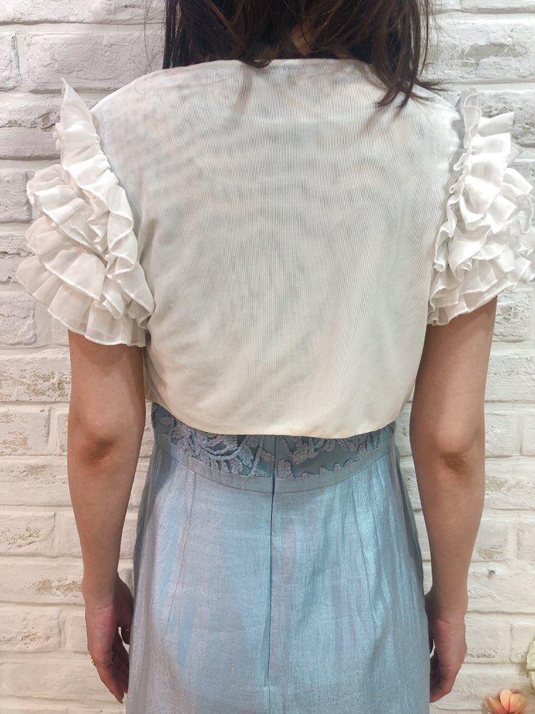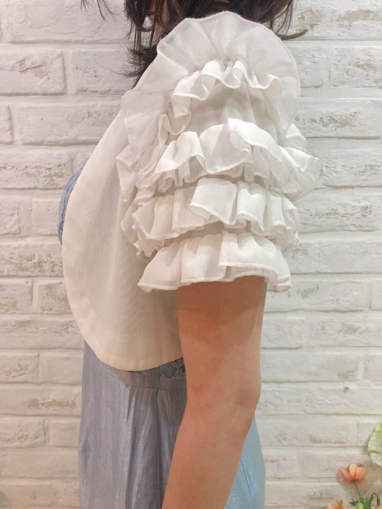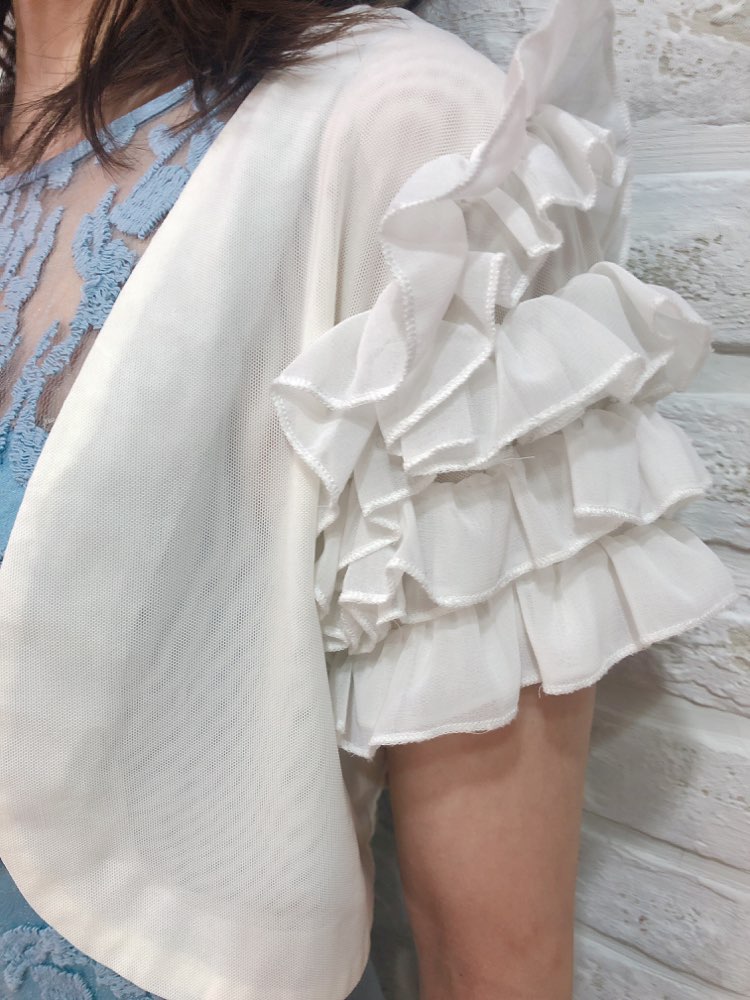 沢山のフリルがついたお袖が印象的なボレロです。女性らしい魅力を引き出してくれます。華やかな装いにもぴったりの一品。