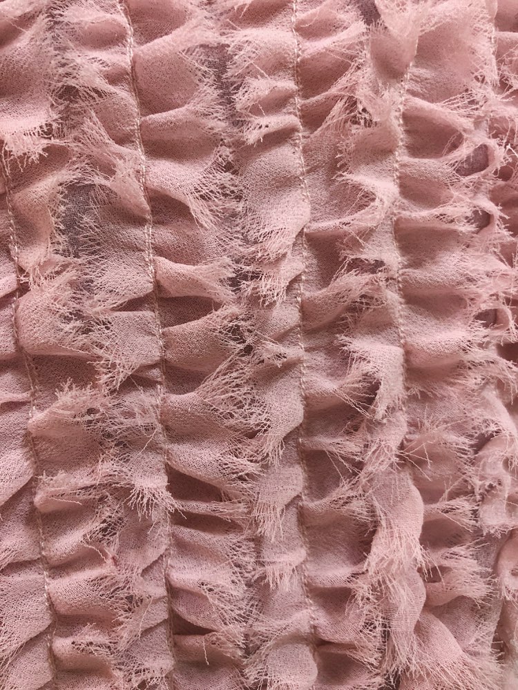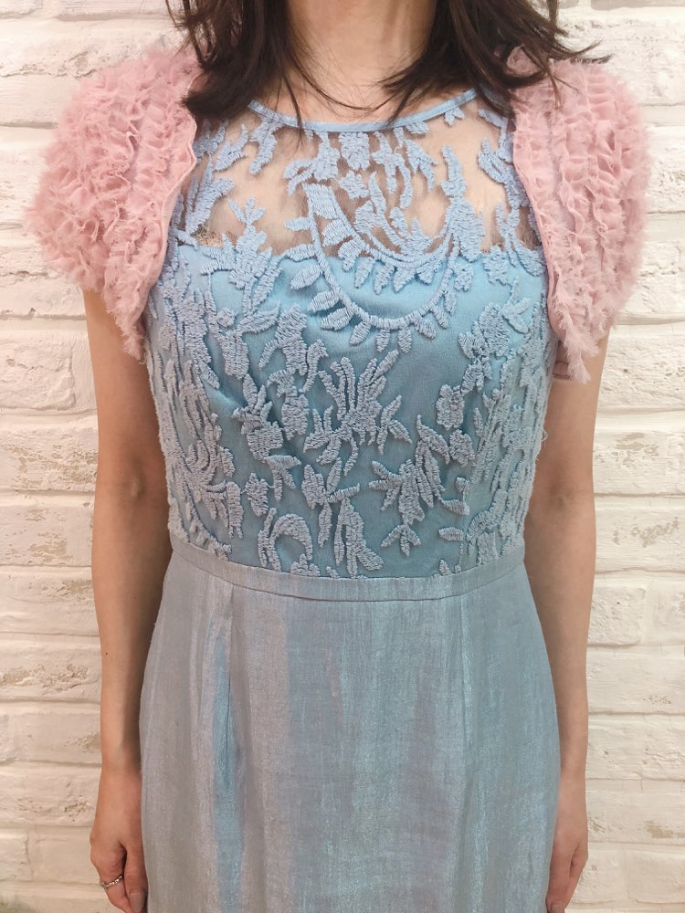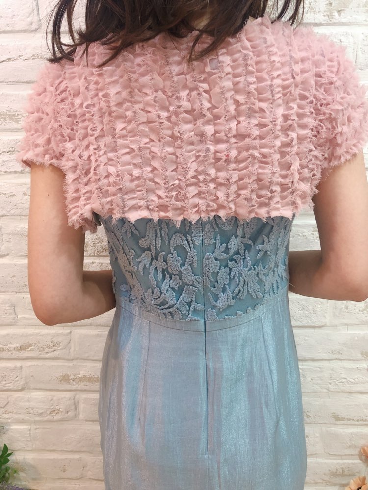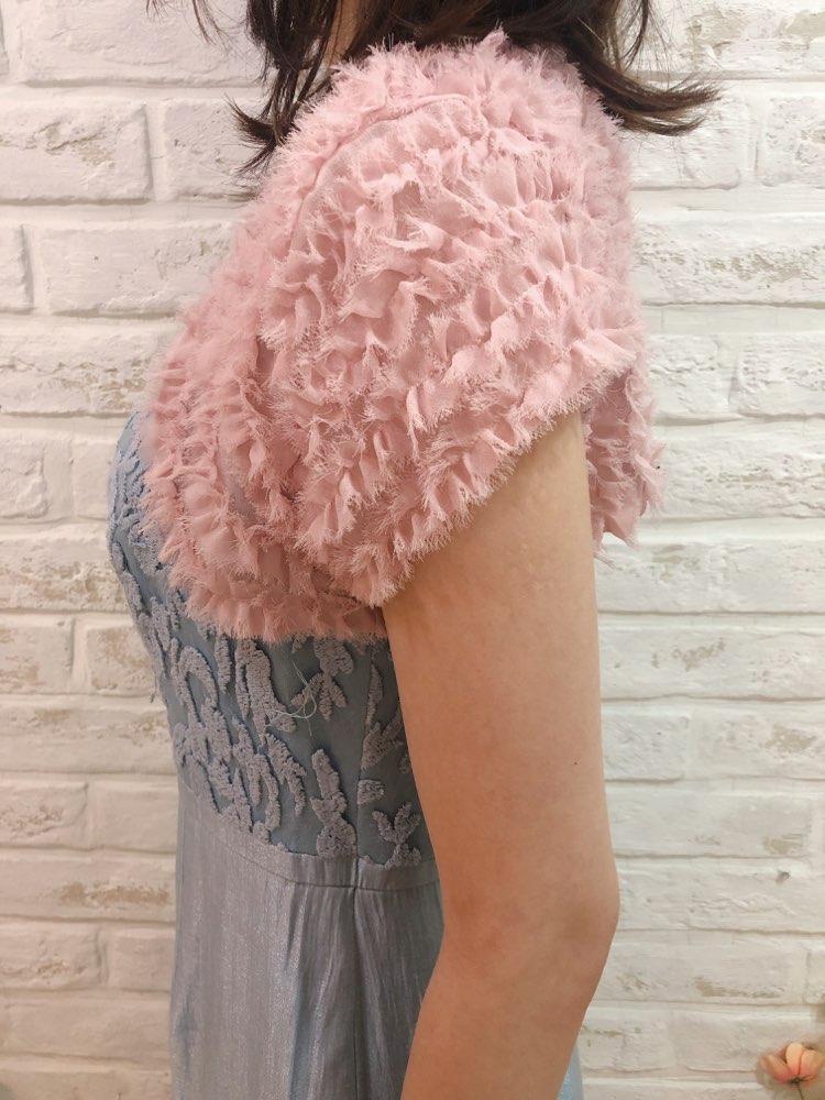 濃いピンクのお色でフリルが全面についたボレロです。 幅広いシーンやドレスにも相性抜群です。