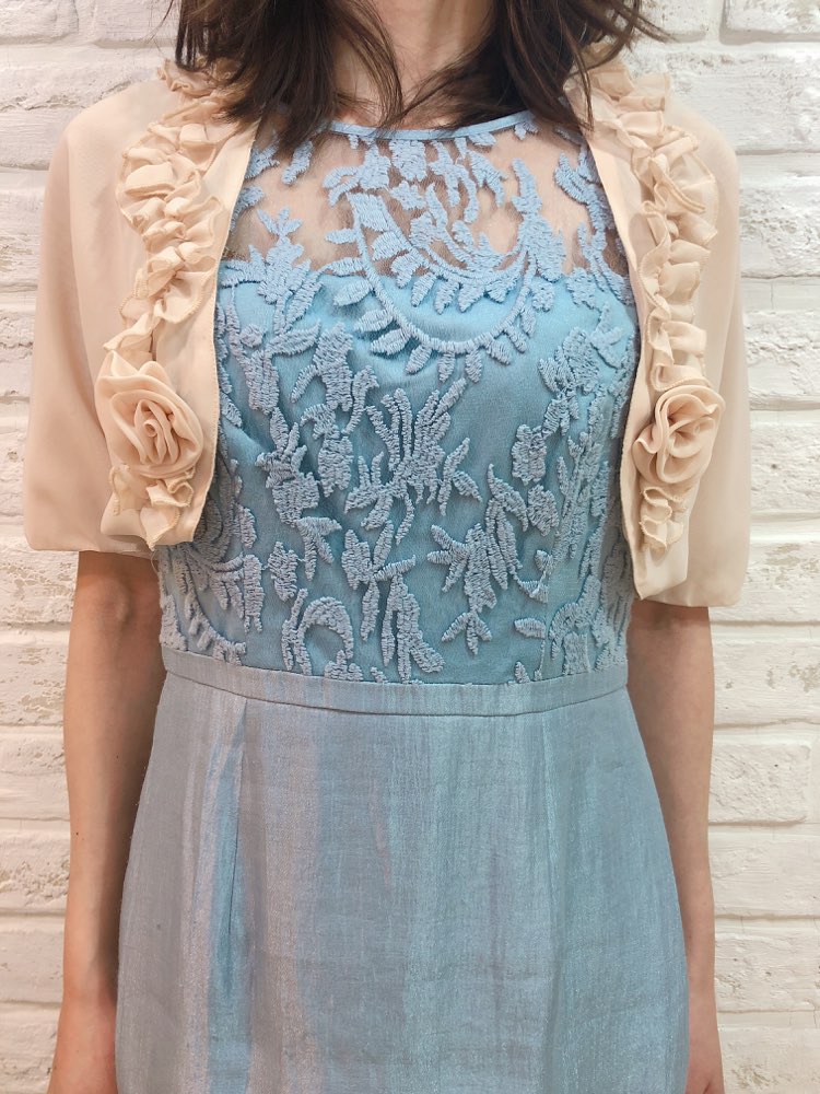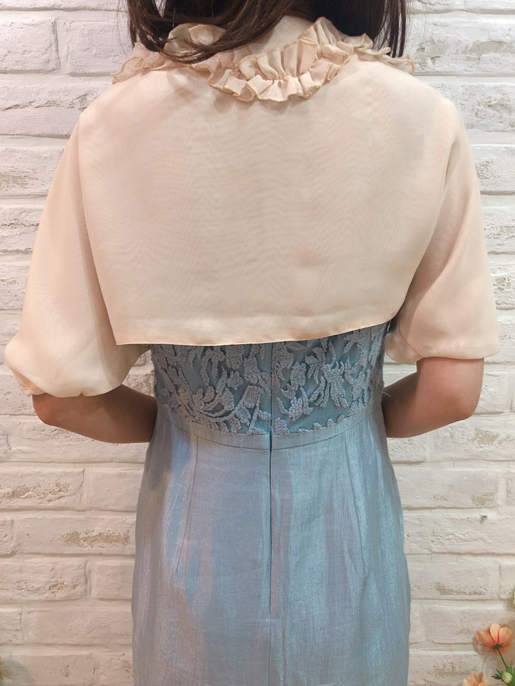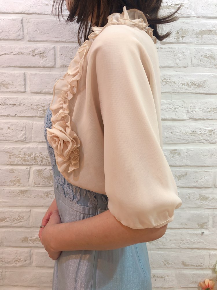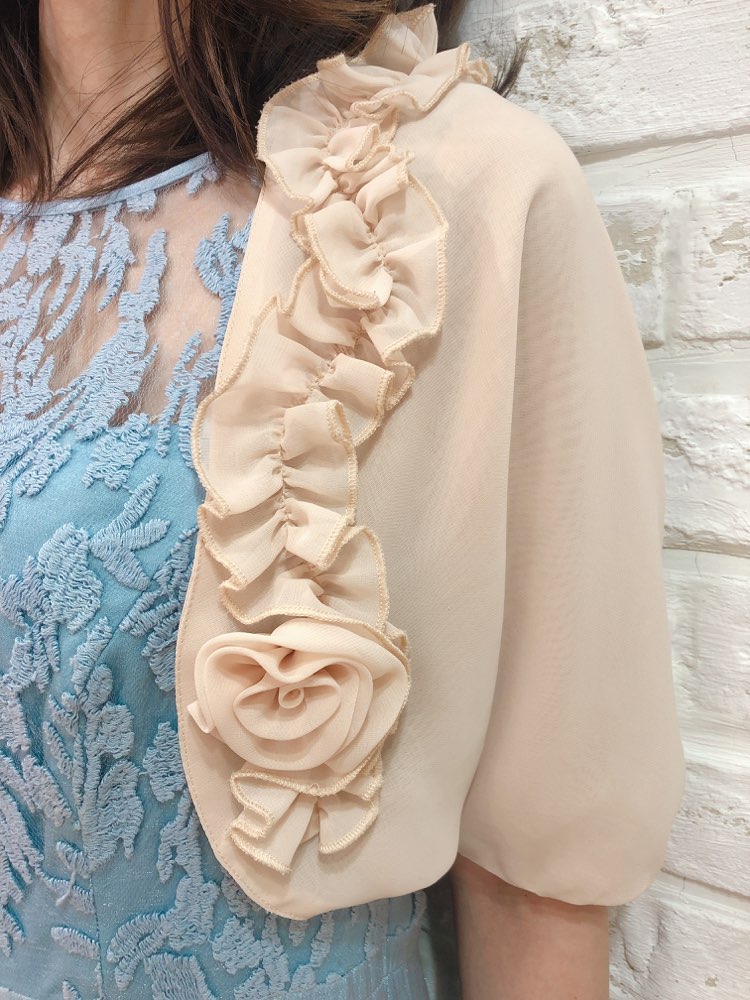襟元にフリル付のピンク色のボレロです。フリルのお袖で二の腕をすっきり見せ、女性らしい魅力を引き出してくれます華やかな装いにもぴったりの一品。 女性らしいデザインが沢山盛り込まれてはいますが、可愛くなり過ぎないのは、ホワイトカラーと軽やかな生地感のおかげ♪ 幅広いシーンやドレスにも相性抜群です。
