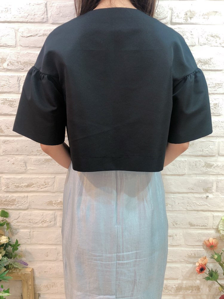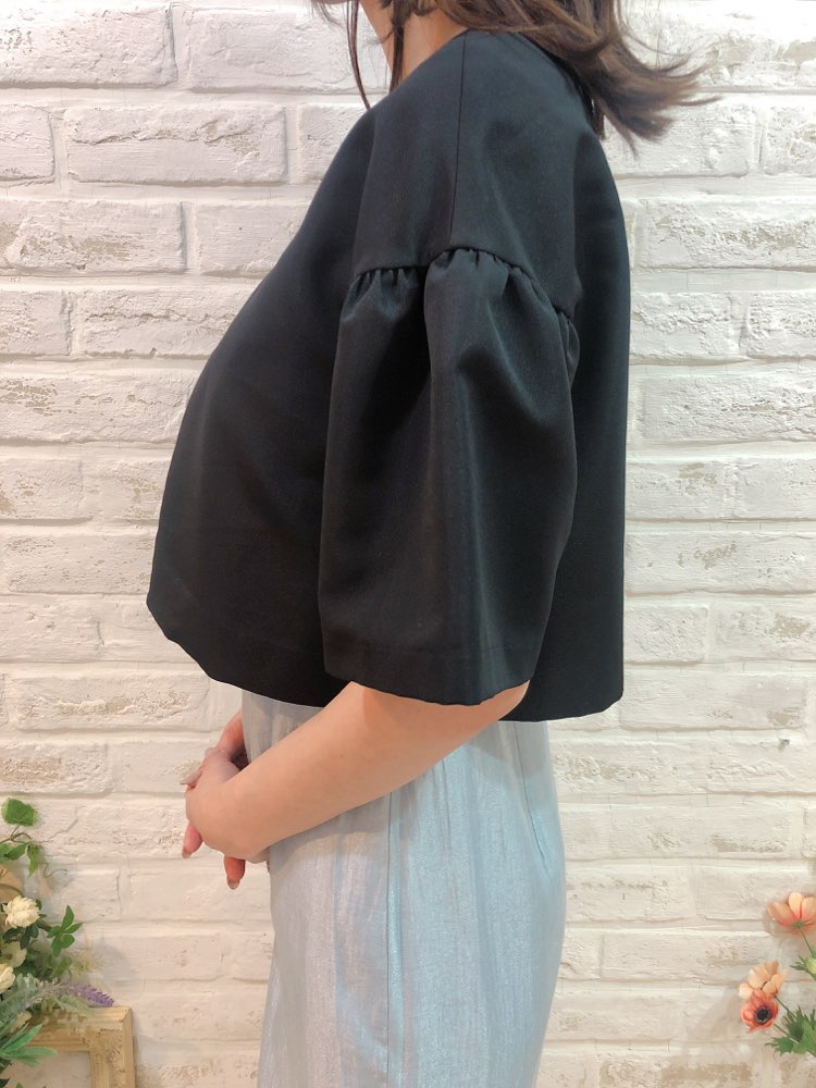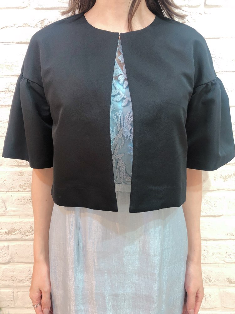 ジャケットとボレロの中間のようなジャレロ風のデザインで、少し長めの5部丈のお袖が、二の腕カバーにも一役買ってくれます。シンプルですが華やかな装いにもぴったりの一品。 幅広いシーンやドレスにも相性抜群です。
