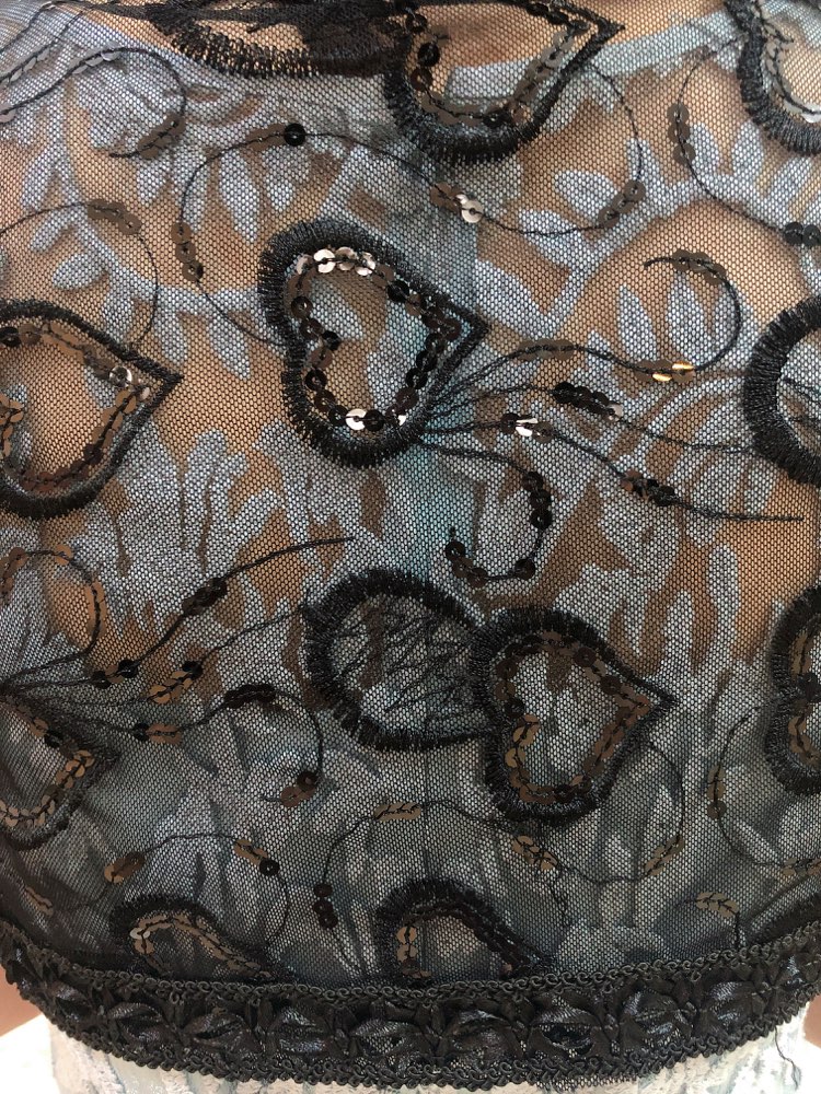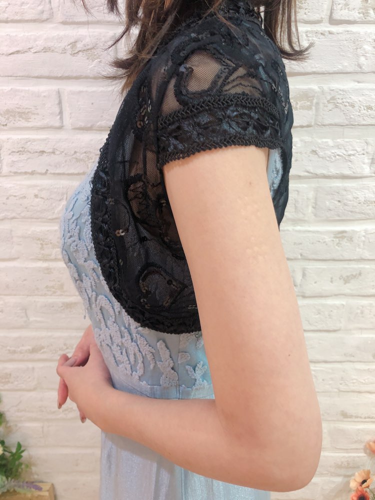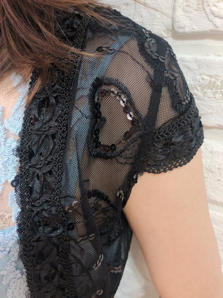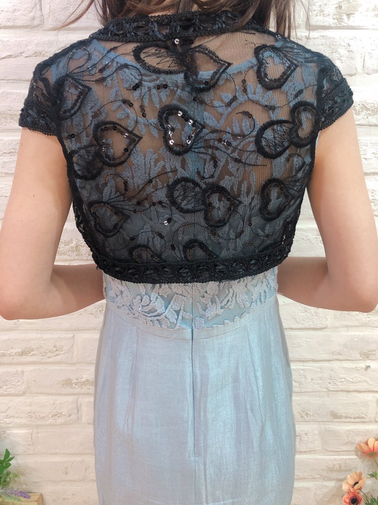 全面レースデザインで、黒のハートの刺繍とスパンコールが華やかな装いにもぴったりの一品。 女性らしいデザインが沢山盛り込まれてはいますが、可愛くなり過ぎないのは、黒色と軽やかな生地感のおかげ♪ 幅広いシーンやドレスにも相性抜群です。