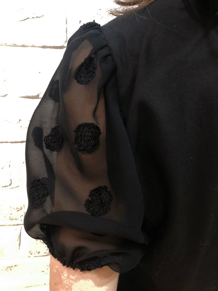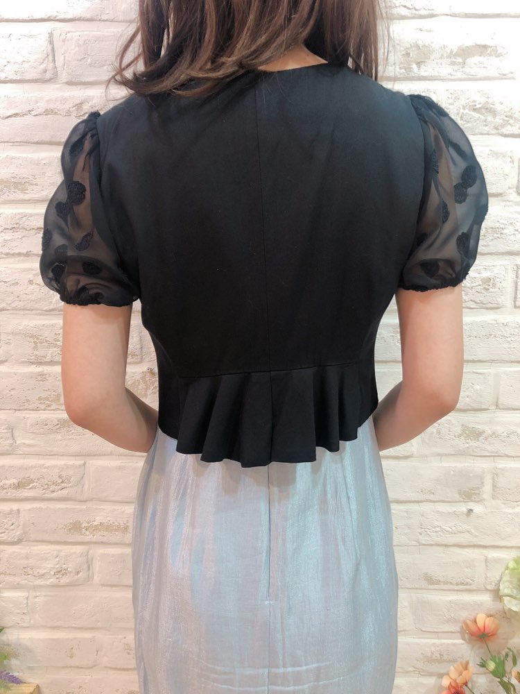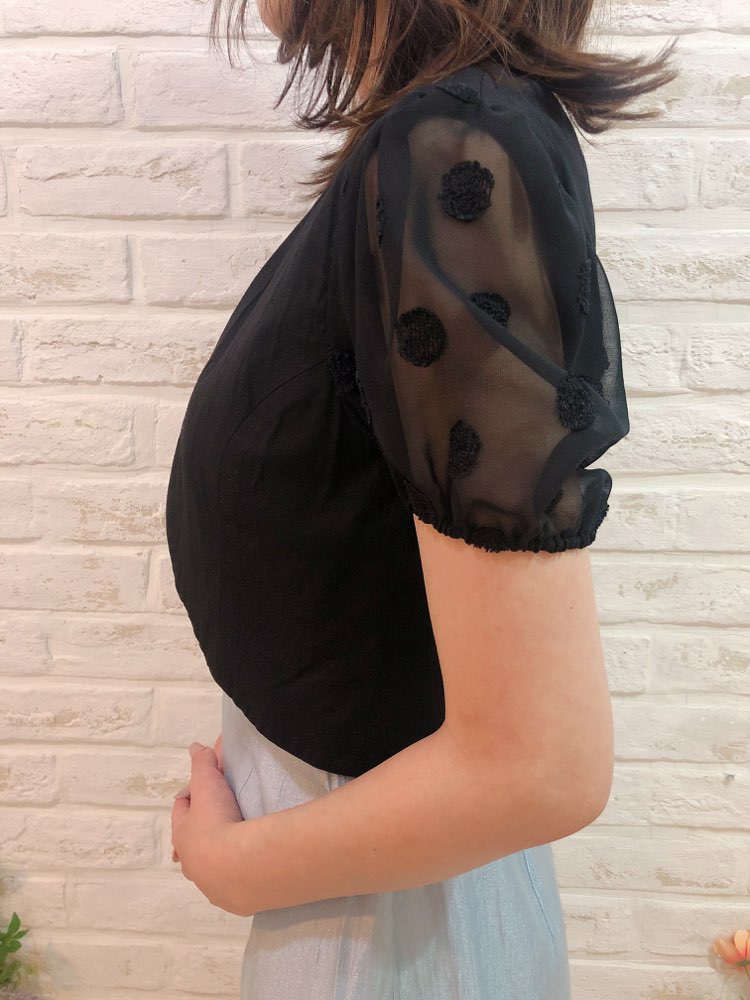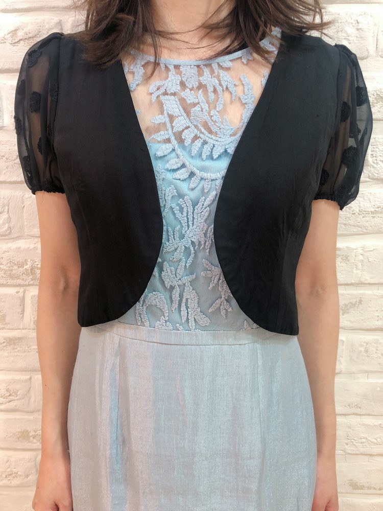 シンプルな形のデザインで、可愛らしい印象のボレロです。お袖は水玉模様のレース素材のパフスリーブになっており、女性らしい魅力を引き出してくれます。華やかな装いにもぴったりの一品。 女性らしいデザインが沢山盛り込まれてはいますが、可愛くなり過ぎないのは、ブラックカラーのおかげ♪ 幅広いシーンやドレスにも相性抜群です。