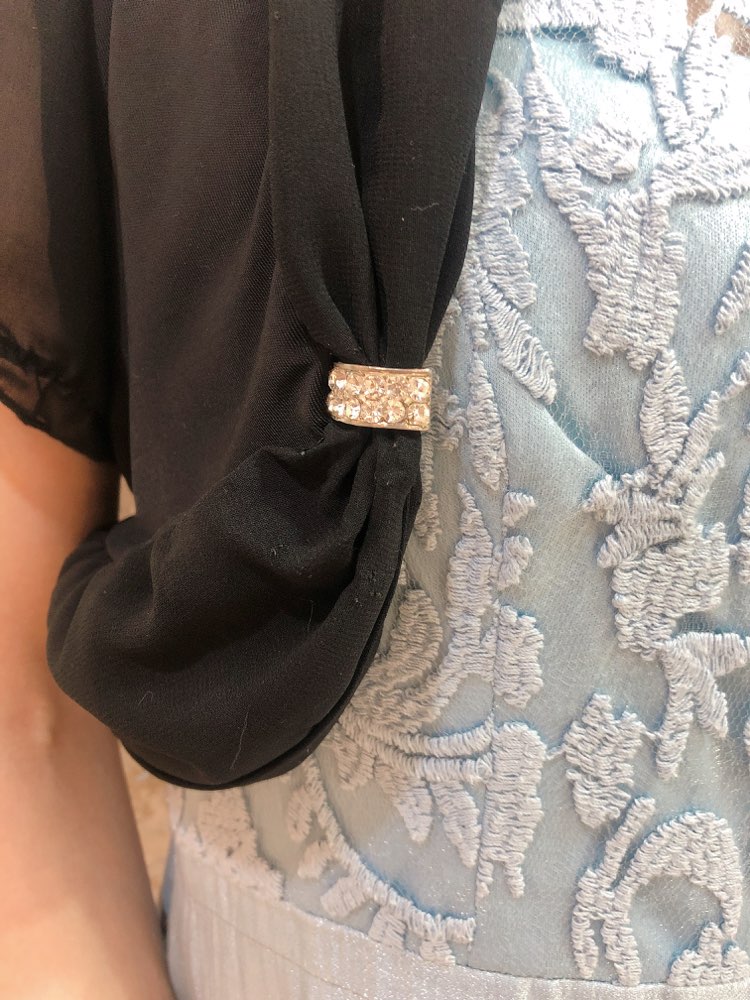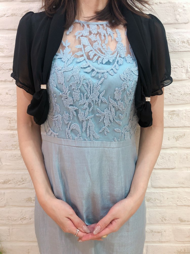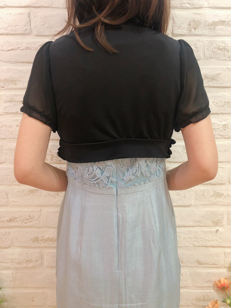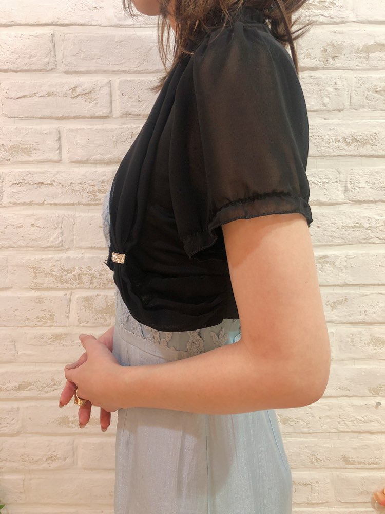 シフォン素材の華やかな印象の黒色のボレロです。華やかな装いにもぴったりの一品。幅広いシーンやドレスにも相性抜群です。