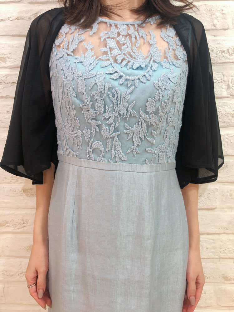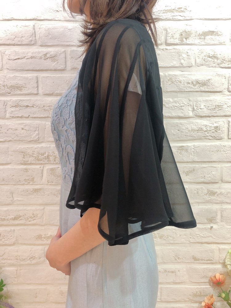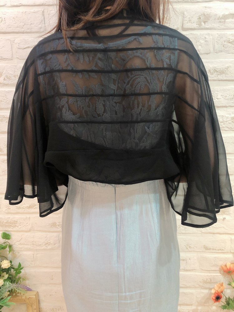 シフォン素材の華やかな印象の黒色のボレロです。横ライン入りでカジュアル感を出しながらも華やかな装いにもぴったりの一品。幅広いシーンやドレスにも相性抜群です。