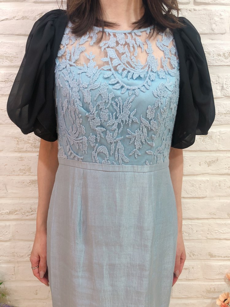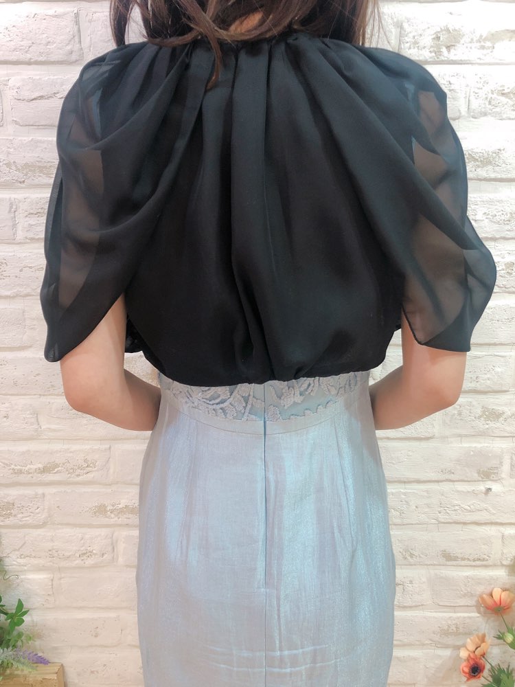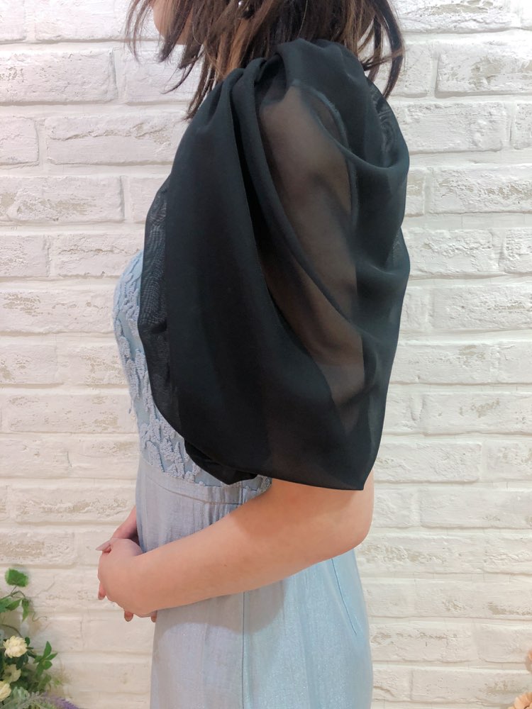 シフォン素材の華やかな印象の黒色のボレロです。お袖部分が透けておりパブスリーブで、華やかな装いにもぴったりの一品。幅広いシーンやドレスにも相性抜群です。