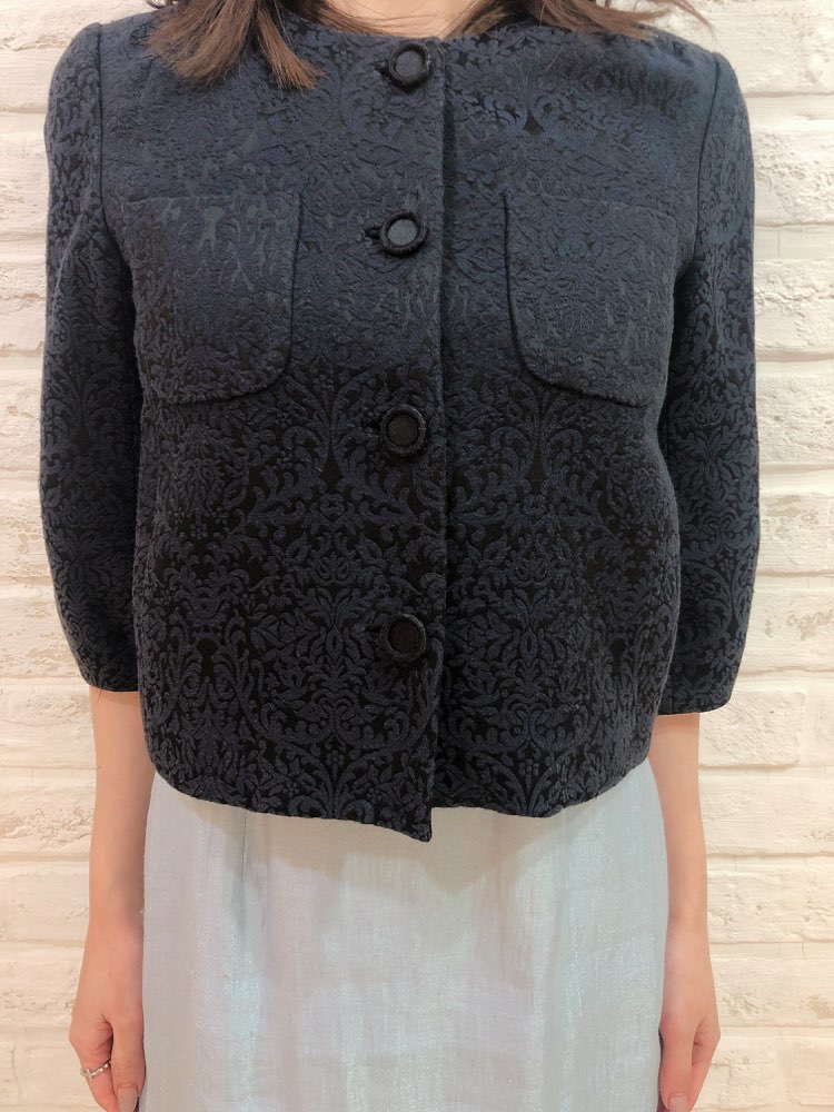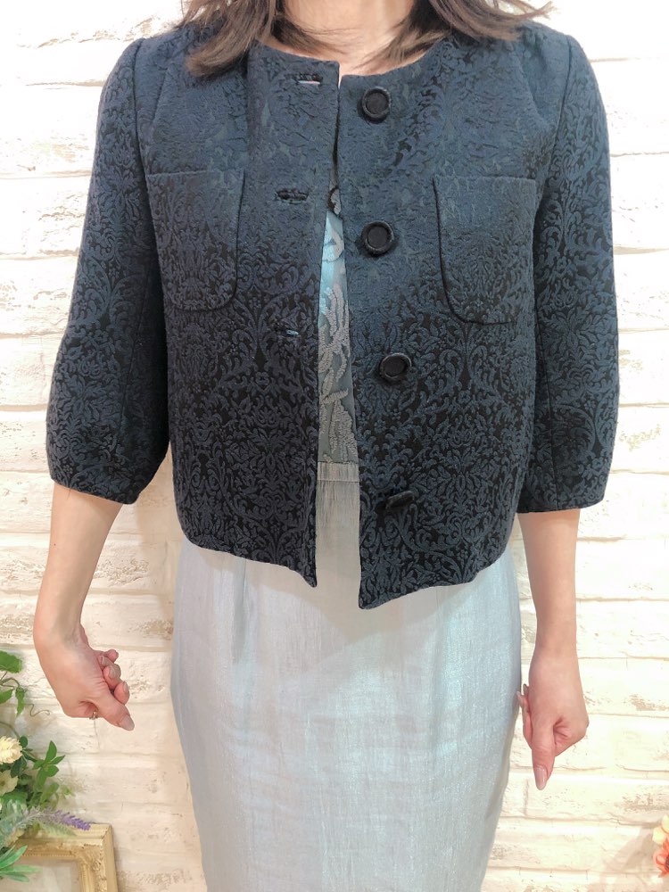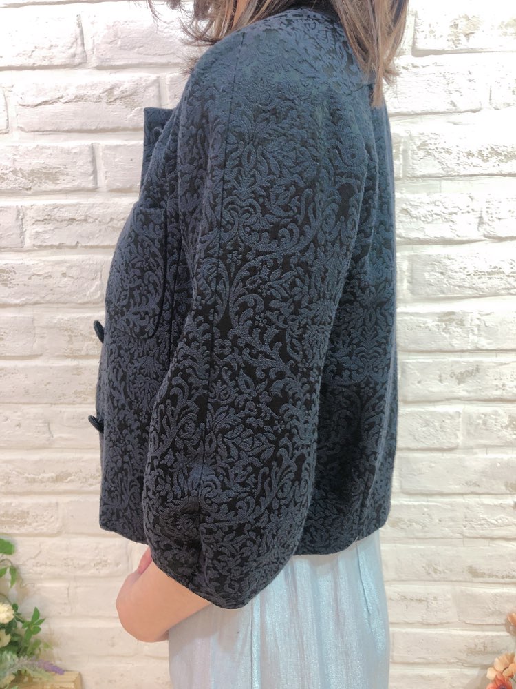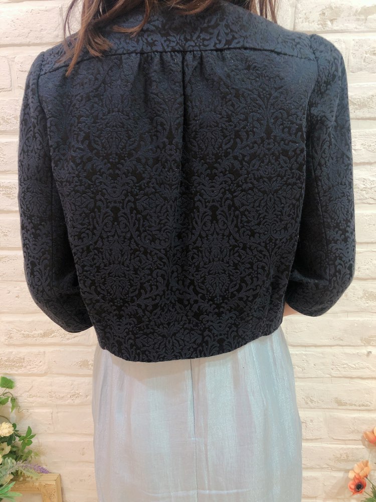 模様入りの黒色ボレロです。華やかな装いにもぴったりの一品。幅広いシーンやドレスにも相性抜群です。