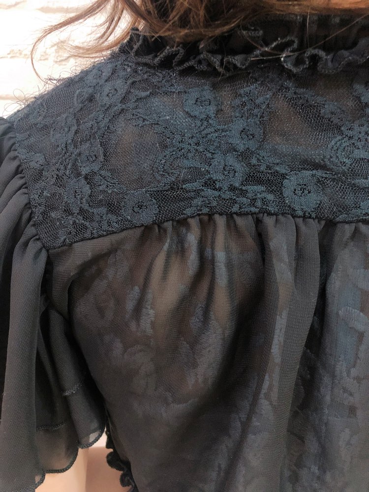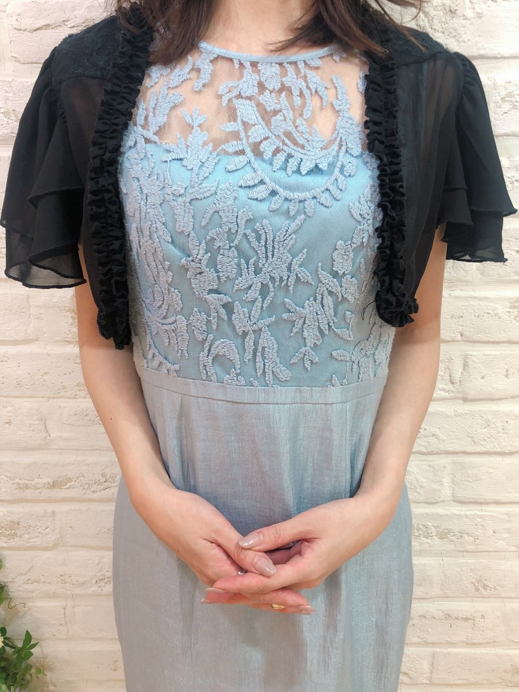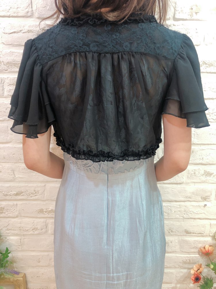 フリルがふんだんについたの黒色ボレロです。レース切り替えや首元にフリル付など華やかな装いにもぴったりの一品。幅広いシーンやドレスにも相性抜群です。