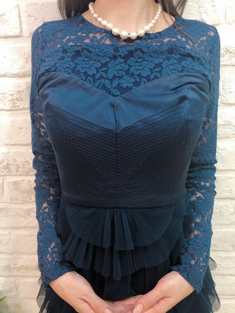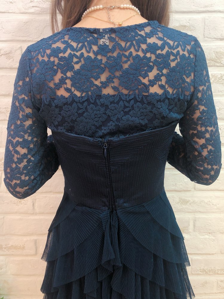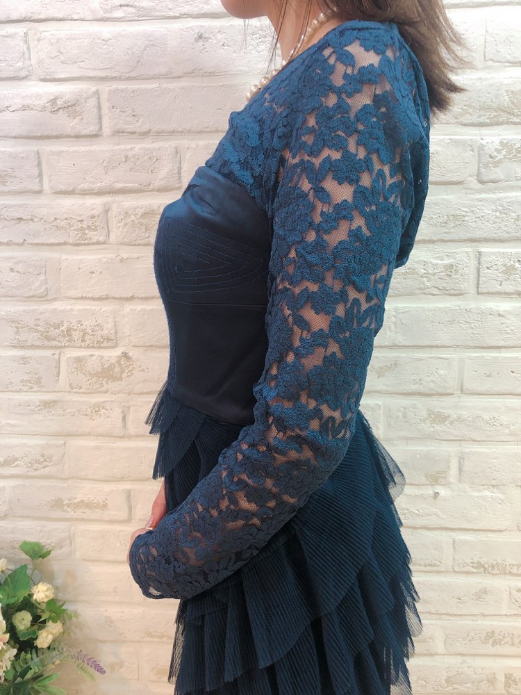 お召し物の中に着ていただくタイプのレース生地で華やかなネイビー色のボレロです。華やかな装いにもぴったりの一品。幅広いシーンやドレスにも相性抜群です。