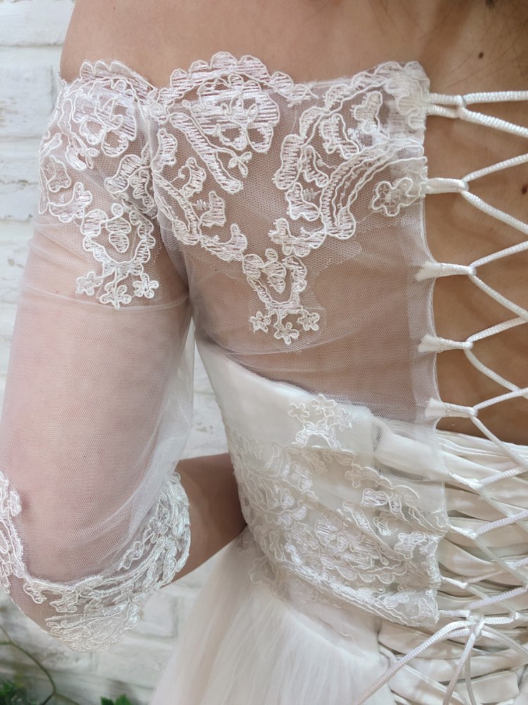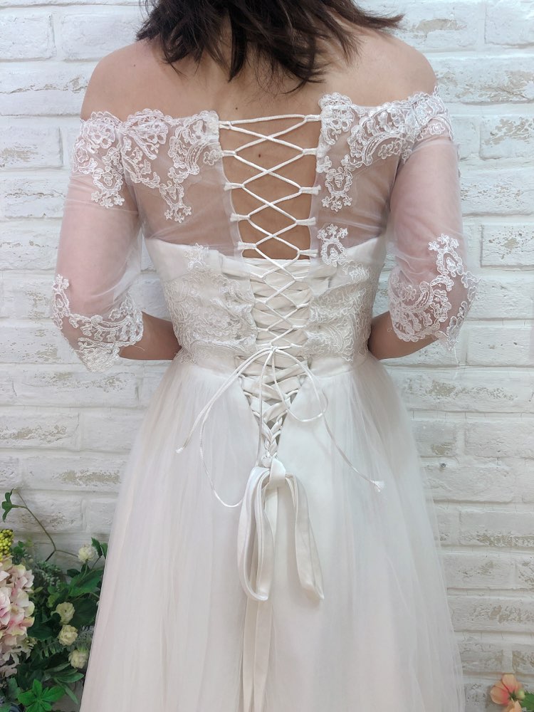 レース素材のバックスタイルは編み上げデザインで、ふんわりとした印象のウェディングボレロです。オフショルダーが女性らしい魅力を引き出してくれ、二の腕カバーにも一役買ってくれます。シンプルでおとなしい色合いですが、レースデザインも入って、華やかな装いにもぴったりの一品。女性らしいデザインが沢山盛り込まれてはいます。
