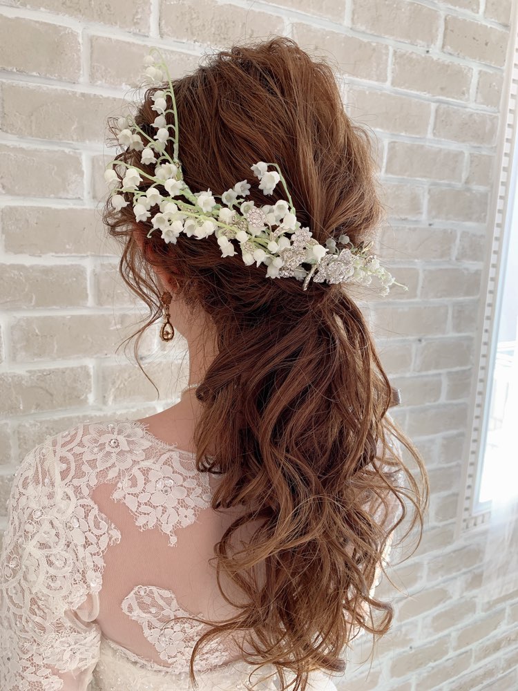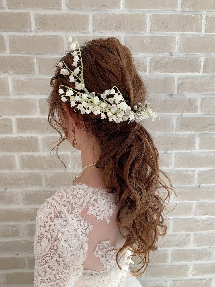 スズランが大胆に装飾され、ビジューが散りばめられた華やかな印象のコーム型のヘッドアクセサリー。スズランは輝くように白く、小さなお花がいくつも集まり可愛らしい花姿の幸せのお花です。スズランの花言葉には『純粋』という意味があり花嫁様にもオススメなヘッドアクセサーです。