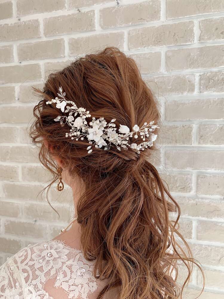 ホワイトフラワーにキラキラしたビジュー枝のように装飾されたオシャレなコーム型のヘッドアクセサー。白いお花は『純粋』、『純粋』、『無垢』などのピュアなイメージがあることから優しく愛らしい印象になるのでアクセントにオススメです。