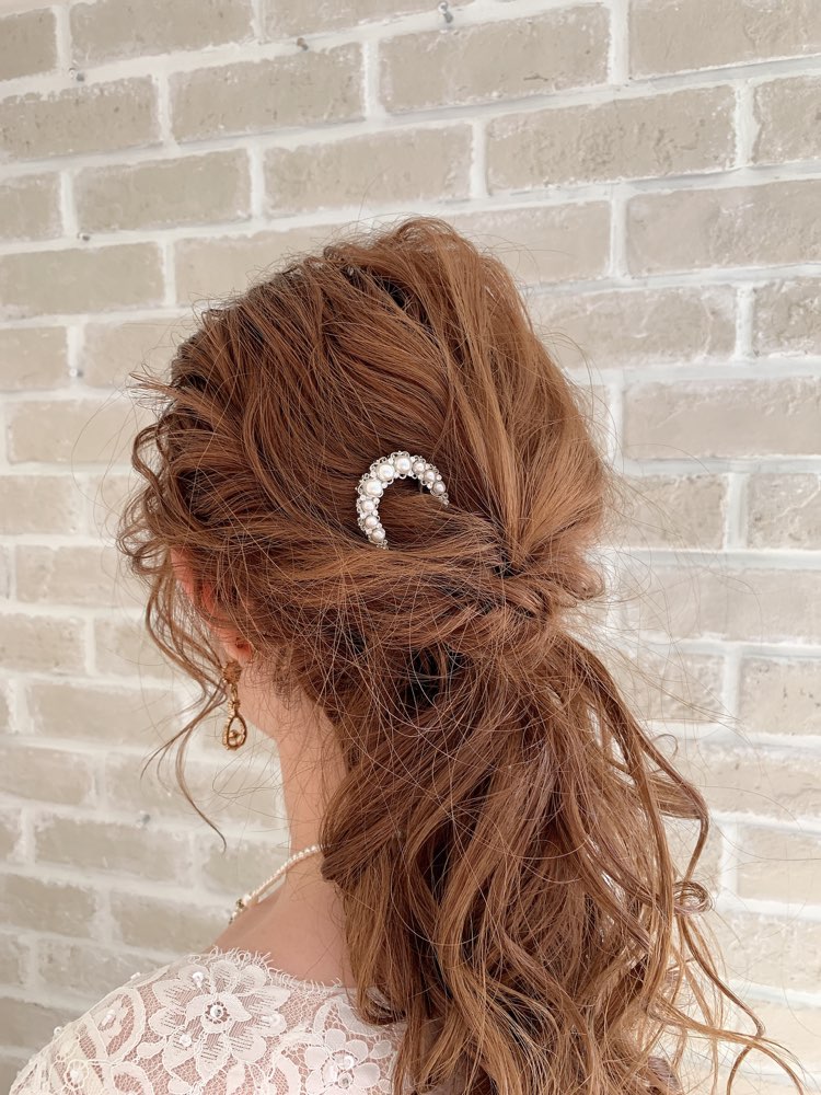 U型のかんざしタイプのヘッドアクセサー。小ぶりなパールのにシルバーカラーのアンティーク調の装飾がアクセントの上品さや気品のある印象にしてくれます。肩にかかる髪の長さのミディアムヘアさんでも胸にかかる髪の長さのロングヘアさんにもオススメなヘッドアクセサーです。U型のかんざしタイプ