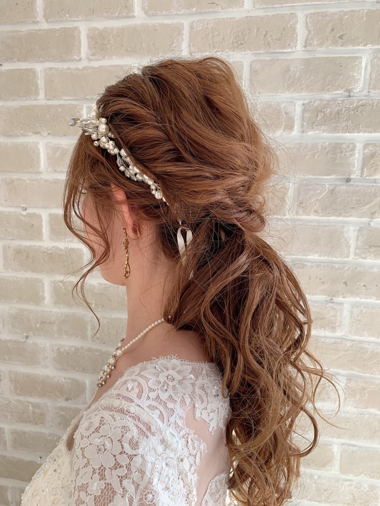 オフホワイトの光沢感のある大小のパールが全体に散りばめられ、アーモンド型のクリスタルビジューがアクセントになっているヘッドアクセサー。花冠のようにセットもでき、ヘアアレンジをしてはめることも出来ます。針金になっているので形を多少変えることができる