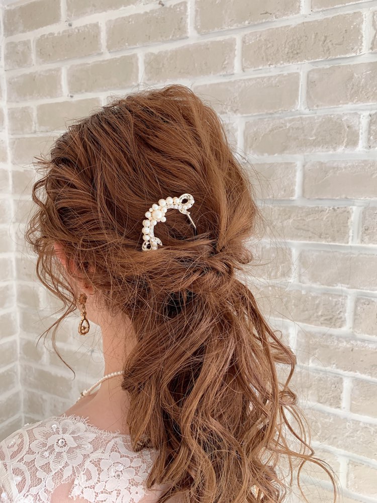 シルバーのカラーにロココ調のデザインが可愛しさを演出してくれるU型のかんざしタイプのヘッドアクセサー。大小のパールにキラキラしたビジュがアクセントになっているので上品さや気品があるので、より一層ヘアスタイルを華やかになります。U型のかんざしタイプ