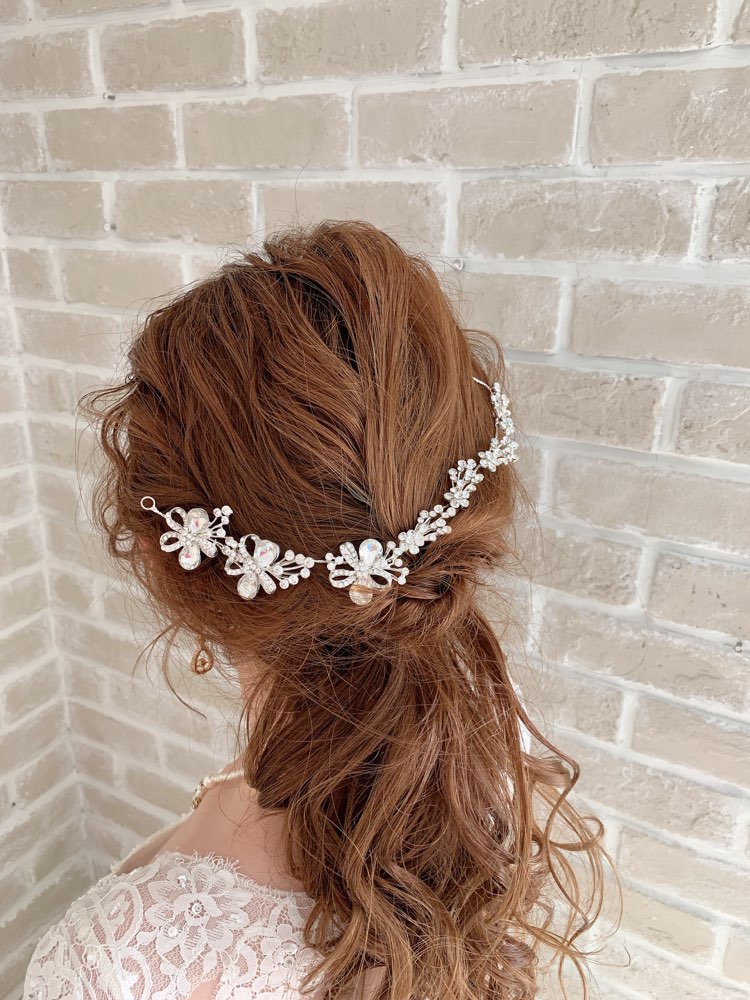 キラキラしたクリスタルビジューと小さめなビジューがお花のデザインが連なっているヘッドアクセサー。キラキラしたビジュが寄り集まっているのでヘアスタイルをより一層華やかにしてくれます。シンプルなデザインのドレスにもゴージャスなドレスにおすすめです。