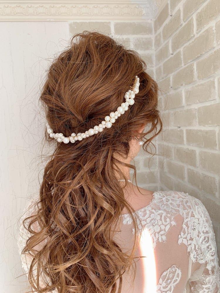 カチューシャタイプにコームが付いてるヘッドアクセサー。骨組み部分のイエローゴールドがところどころに見え隠れるしているので上品な印象と、大小のパールの女性らしい、可愛らしい印象が演出できるのでアクセントにお付けしてみてはいかがでしょうか。