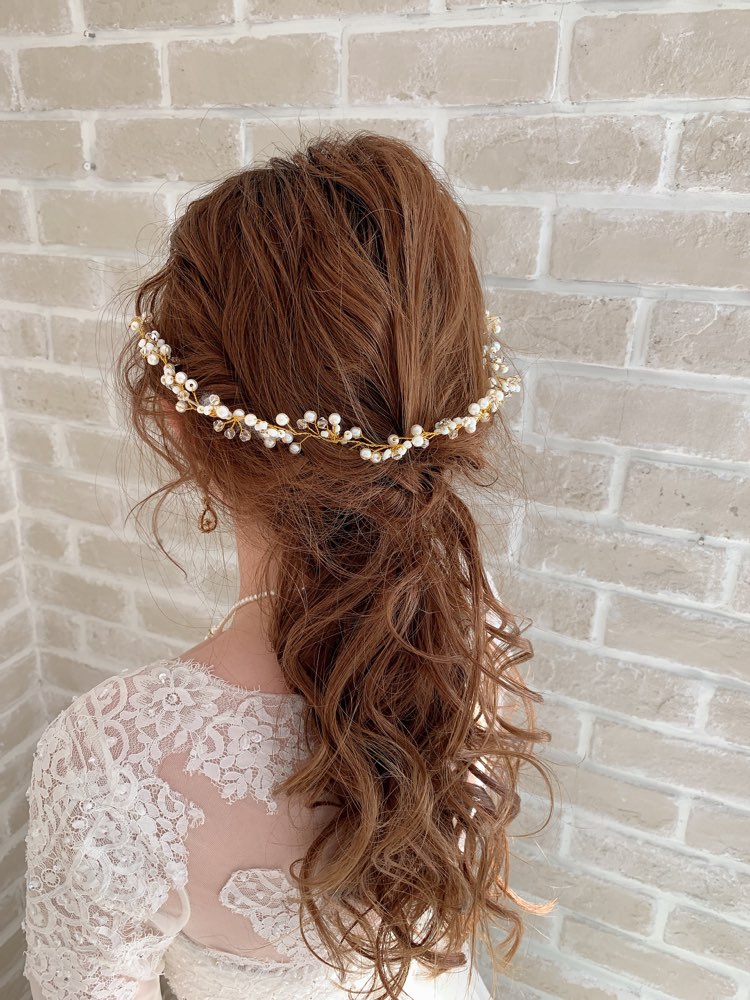 イエローゴールドにマットな小粒なビジューと光沢感のあるパール、クリスタルビジューが程よくあしらわれていて小枝がモチーフのナチュラルなヘッドアクセサー。程よくあしらわれていたビジューが自然な感じなのでシンプルなドレスでもゴージャスなドレスでもアクセントになります。