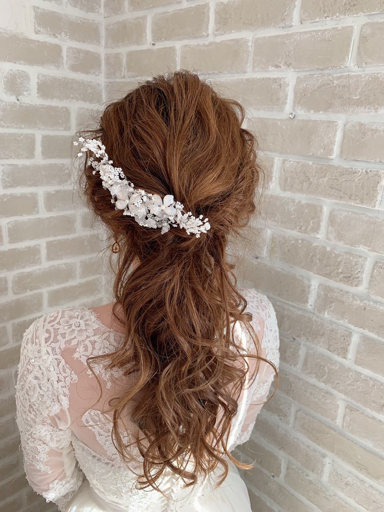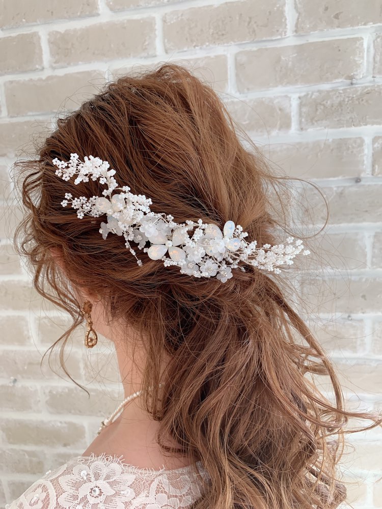 白い小さなお花が散りばめられ、オーロラのしずく型のクリスタルビジューで大きめのお花がポイントになっている清潔感のあるヘッドアクセサー。白ベースのそれぞれ装飾が違う大中小のお花が程よく寄り集まっているので、花嫁のウェディングドレスに映える事間違いなし♪