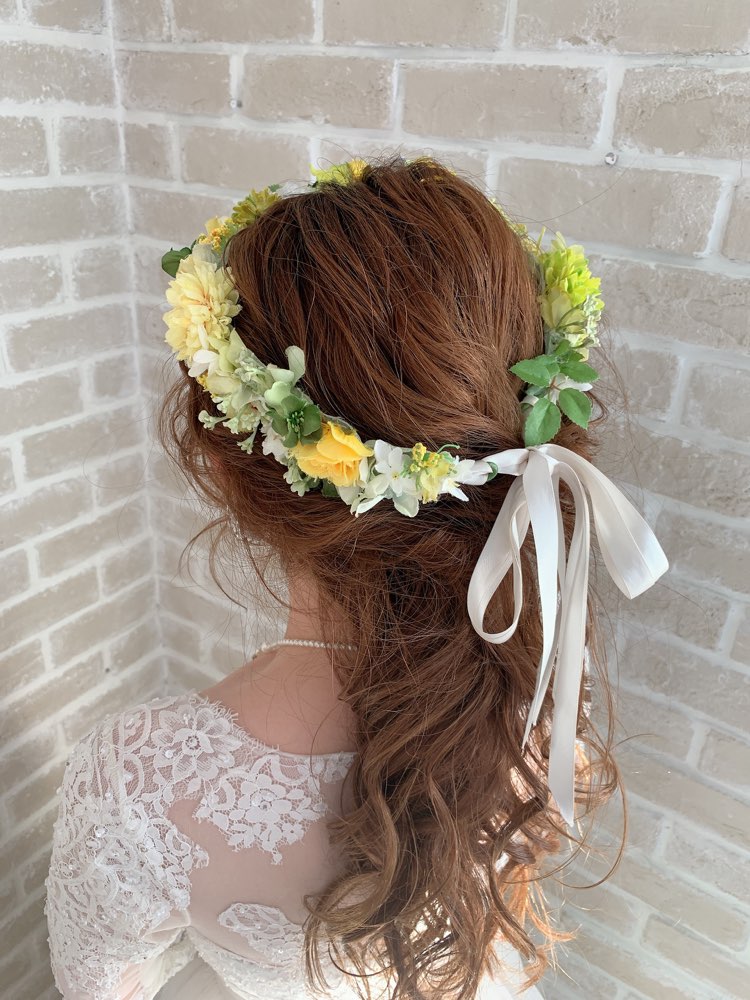 イエロー×グリーンカラーベースの花冠のヘッドアクセサリーです。タンポポのお花がたくさんあしらわれていて、鮮やかな黄色いお花がアクセントになっています。ナチュラル感があり、全体的に柔らかな印象を演出することができます!花嫁様のホワイトカラー、オフホワイトカラーのウェデのイングドレスでもお付けできます。