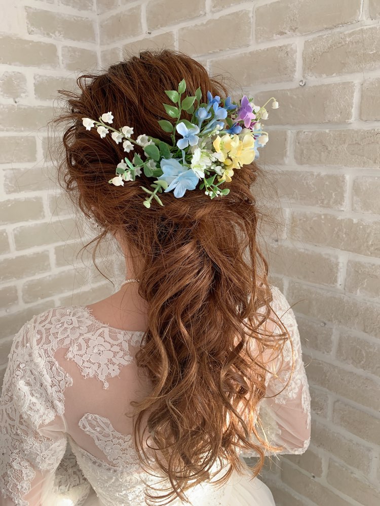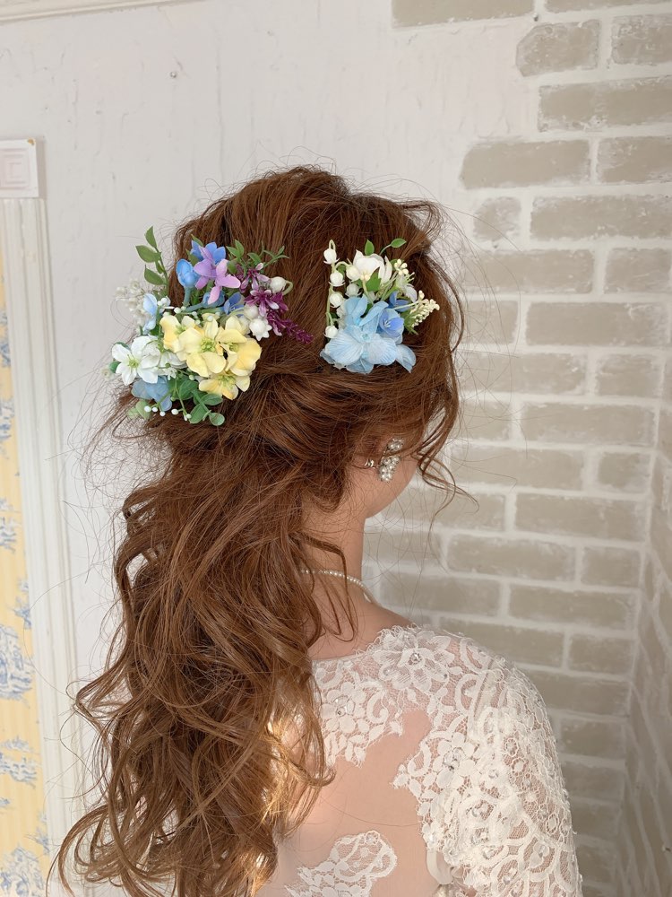 ブルー×イエローカラーベースの花飾り。パステルカラーの優しいブルーとイエローのお花が散りばめられ、スズランの白い小さなお花がアクセントになっていて可愛らしいです。全体的に優しい印象で、ナチュラルなデザインなので、花嫁様にオススメです★飾りが大きめのコームが付いてるものと別に、小さめパーツが4つに分かれているので、アレンジの際に散りばめてつけても、飾りをまとめてもお付け出来ます!付属品のミニパーツ4つあり