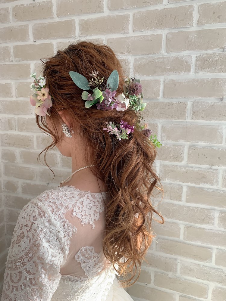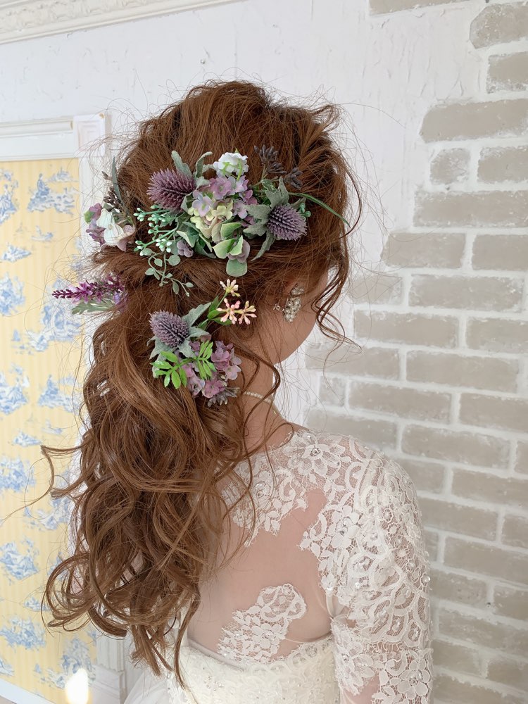 パープル×グリーンカラーベースの花飾り。カラーベースがパープルで、パープルの代表的なお花のアジサイ、すみれの花、ラベンダー、パンジーなどの花々が使用されています。パープルのお花のイメージや花言葉として、『高貴な花』と言われています。かつての西洋では、王家のシンボルカラーとしてされていました。パープルの花飾りをヘアスタイルにプラスすれは、上品でエレガントな魅力がアップされること間違いなしです♪各お花のごとにパーツ分かしています。(7パーツあります)