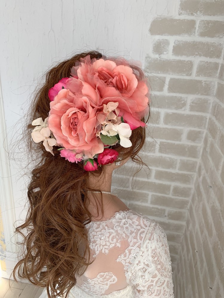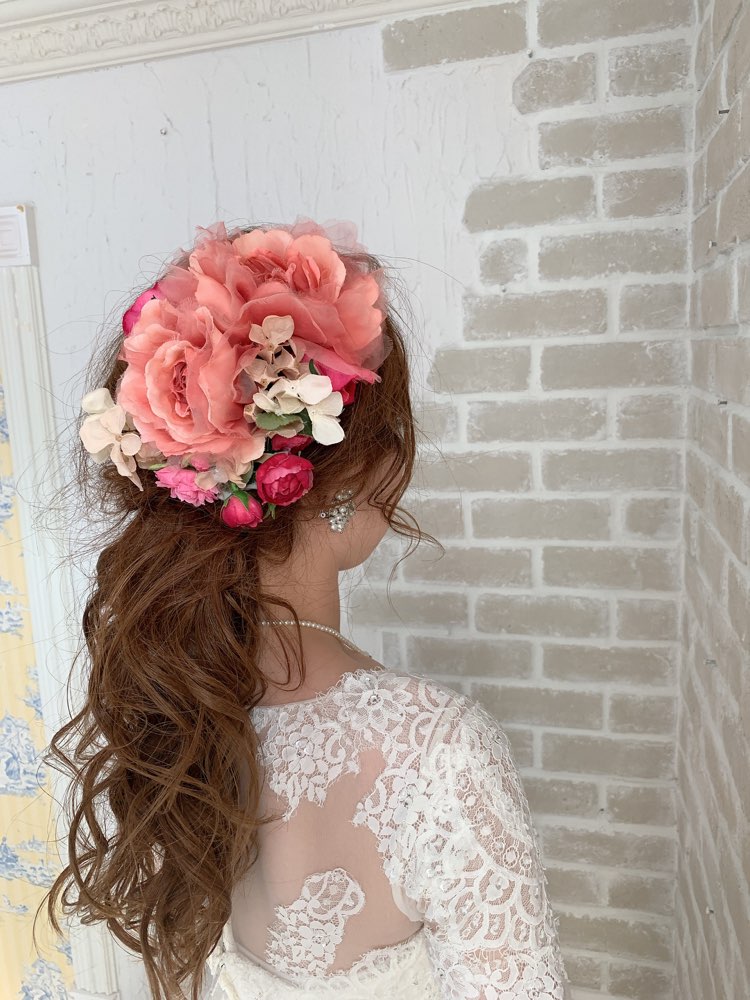 アンティーク調を漂わせる淡いピンクローズ(薔薇)のコーム型のヘッドアクセサリー。全体的に淡いピンクベースのバラがあしらわれていてエレガントな印象です。薔薇の花言葉の意味として『愛』、『美』の象徴とされています。そして、ピンクの薔薇の花言葉は『淑やか』、『上品』、『感銘』という意味があります。ヘアスタイルにプラスしてより一層レディーらしさをアピールしてはいかがでしょうか。