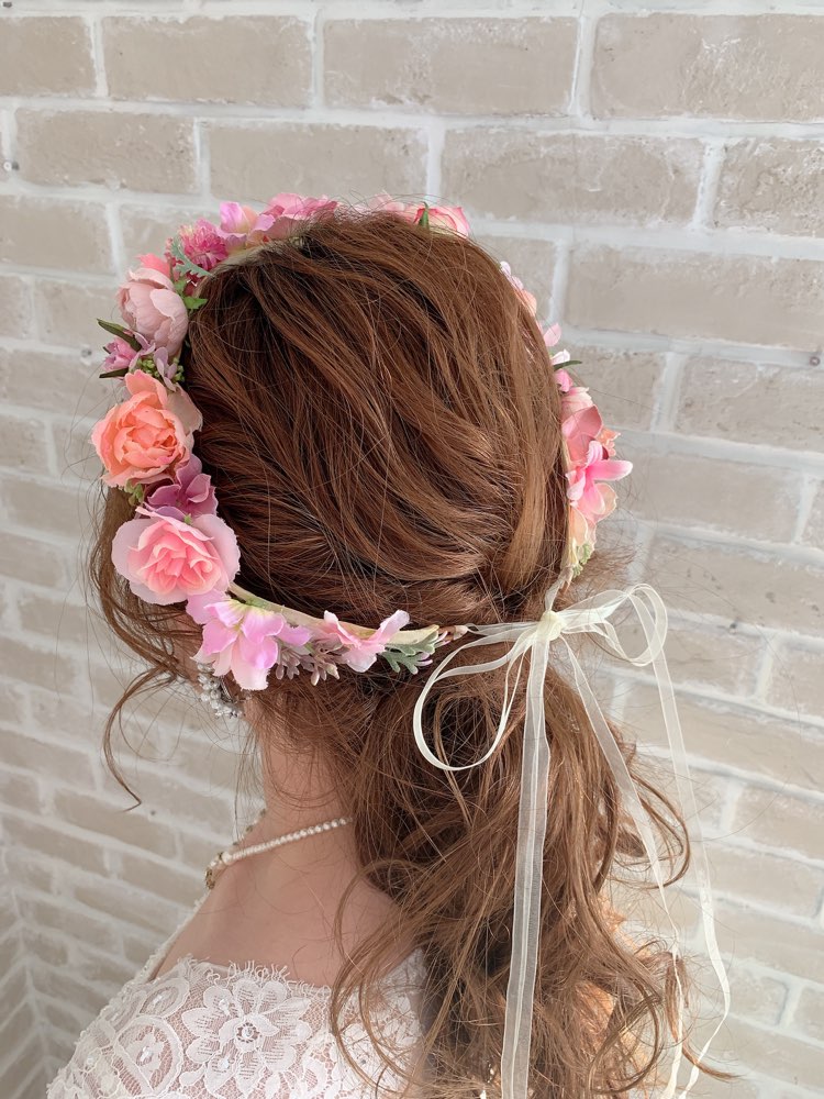ピンクローズのキュートな花冠です♪ピンクの満開のバラが並べられたデザインです。バラにはカラー、状態や咲き具合、本数によっても意味合いがひとつひとつ違います。ピンクのバラには、『淑やか』、『上品』、『可愛い人』、『愛の誓い』などの意味があり、満開のバラには、『私は人妻』などの意味があります。花嫁様のウェディングドレスのアクセントにもなりますし、お守りアイテムとして身に付けてはいかがでしょうか。
