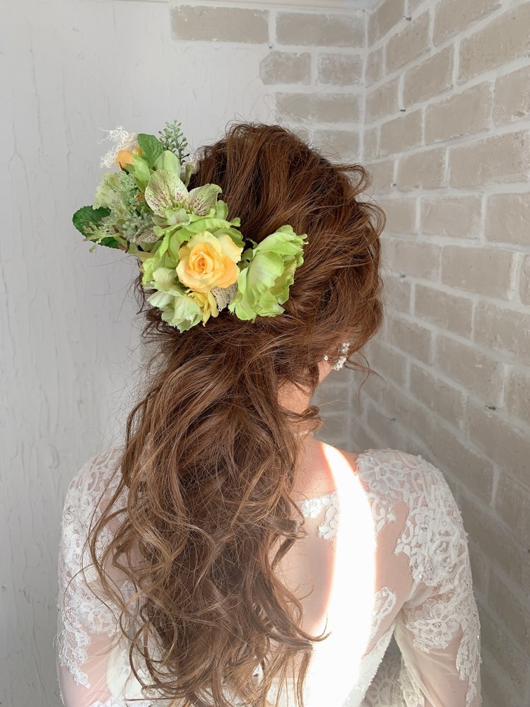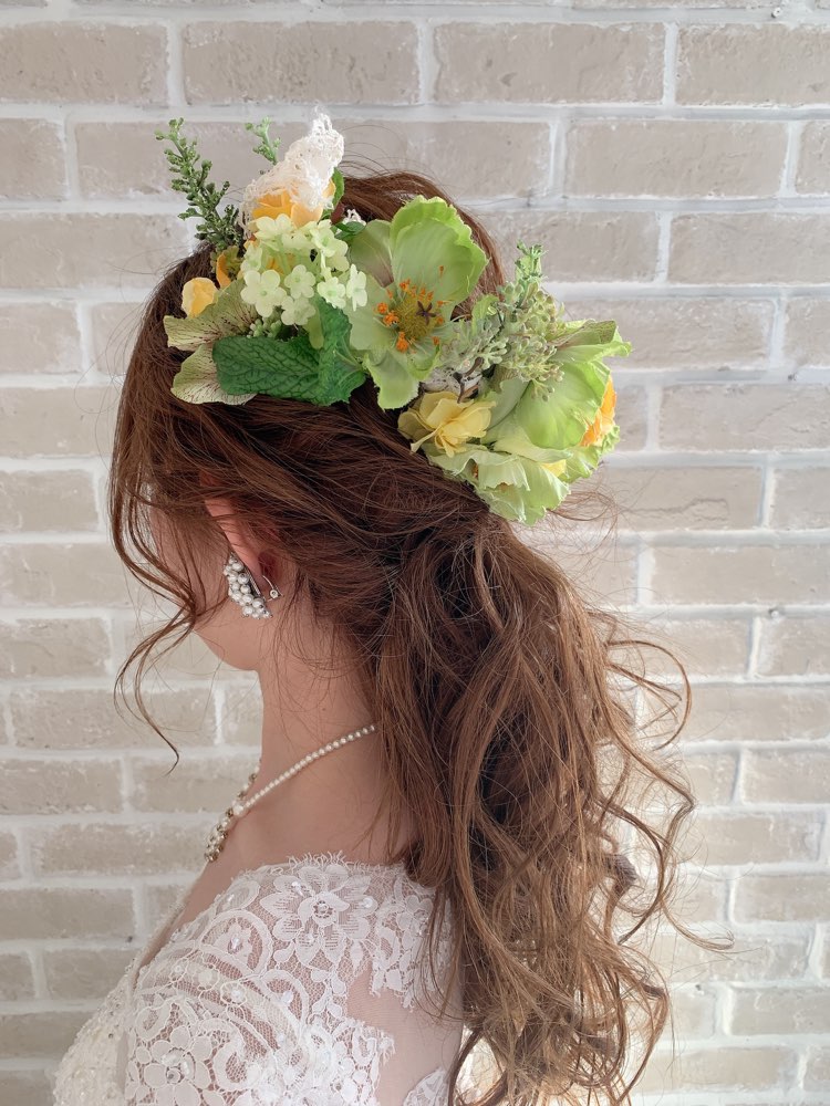 イエロー×パステルグリーンのコームタイプの花飾り。イエロー、グリーンの花々で彩られていて全体的に柔らかでナチュラルな印象です。なかでもパステルグリーンを多く使用していて、パステルグリーンのカラーイメージや意味として、『新しい事をする』、『フレッシュ』という意味があり、『平和』や『平等』などの意味合いがあります。結婚式というお二人にとっての大事な’’新しいスタート’’の架け橋のアイテムとしてヘアスタイルに取り入れてみてはいかがでしょうか。