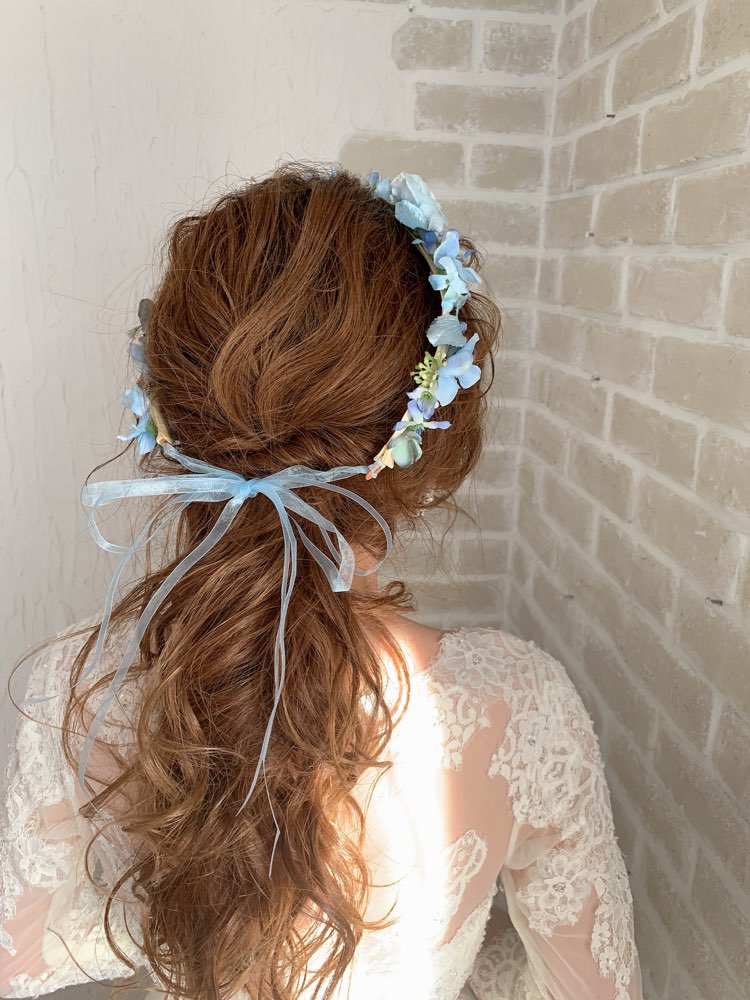 ナチュラルブルーの花冠です♪パステルブルーベースのそれぞれのお花で飾られた花冠になっています。中でも多く飾られている’’ブルースター’’。結婚式ではしきたりやサムシングブルーなどで言わずと知られているお花です。サムシングブルーとは、新郎新婦様の永遠の幸せを願った言い伝えの一つです。『花嫁の清らかさと誠実な愛』という意味が込められています、ブルーの花冠を取り入れてより一層素敵なお式にしてはいかがでしょうか。