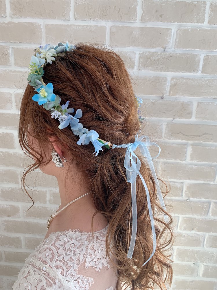ナチュラルブルーの花冠です♪パステルブルーベースのそれぞれのお花で飾られた花冠になっています。中でも多く飾られている’’ブルースター’’。結婚式ではしきたりやサムシングブルーなどで言わずと知られているお花です。サムシングブルーとは、新郎新婦様の永遠の幸せを願った言い伝えの一つです。『花嫁の清らかさと誠実な愛』という意味が込められています、ブルーの花冠を取り入れてより一層素敵なお式にしてはいかがでしょうか。