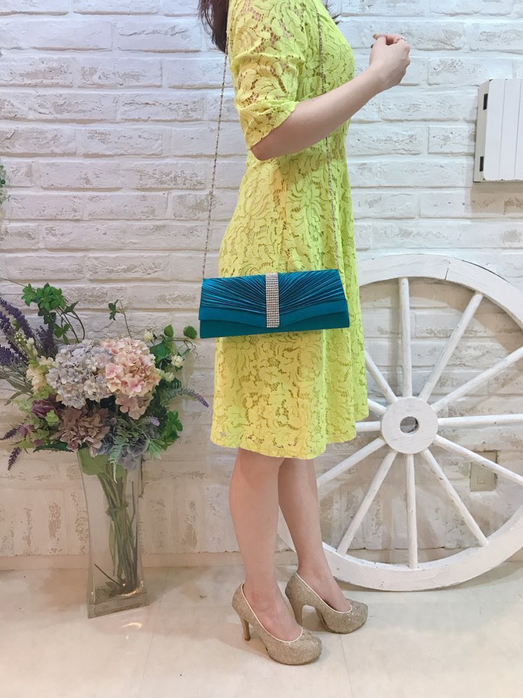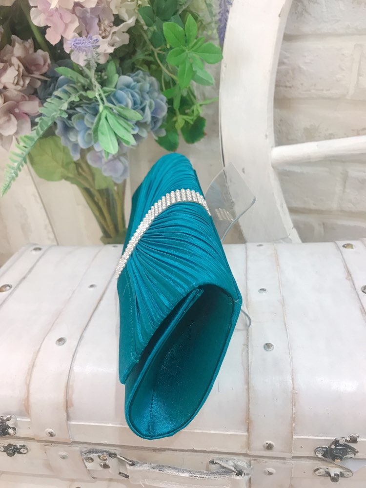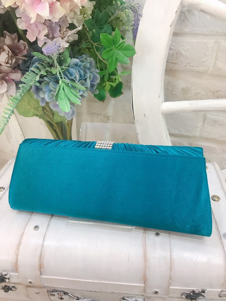 ターコイズブルーのクラッチバッグ。細かいプリーツが中心に集まるよにデザインされていて、その上にラインストーンがデザインされてます。シンプルなデザインの中に華やかさがあります。チェーン付きの2way仕様なので、利用シーンによって持ち方を替えられるのも嬉しいポイントです。結婚式や二次会、各種パーティなど華やかな場面にぴったりなバッグです。