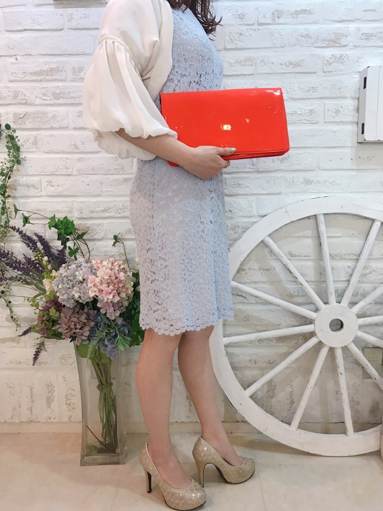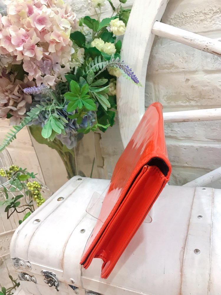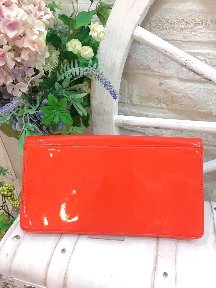 ビビットなオレンジカラーのエナメル素材のクラッチバッグ。チェーン付きの2way仕様なので、利用シーンによって持ち方袱紗が入る大きさで、収納力もあり抜群の機能性。結婚式や二次会、各種パーティなど華やかな場面にぴったりなバッグです。