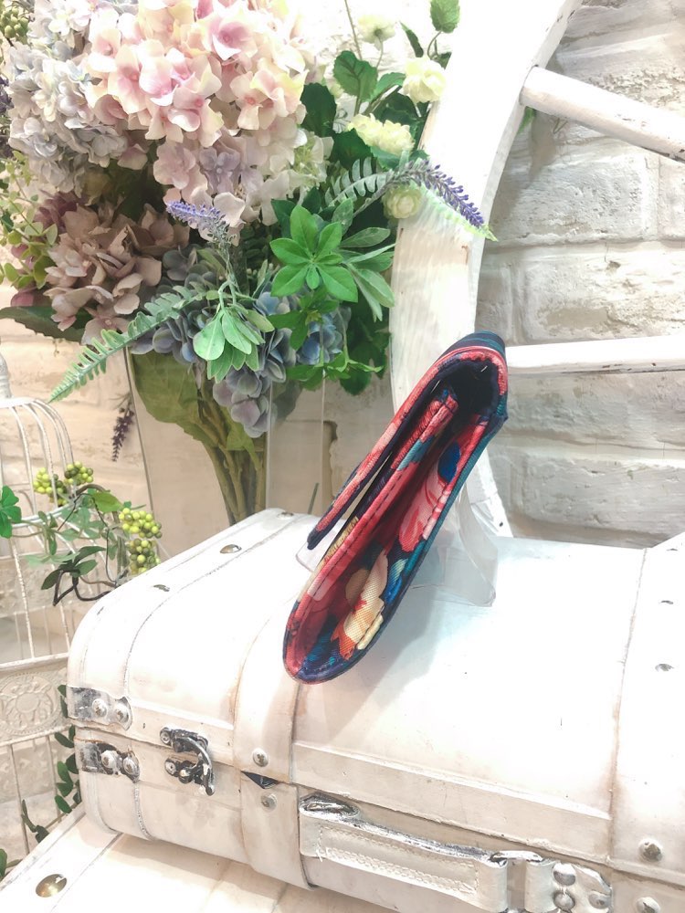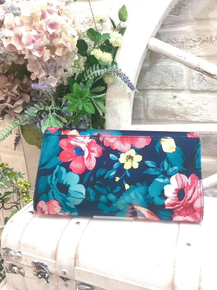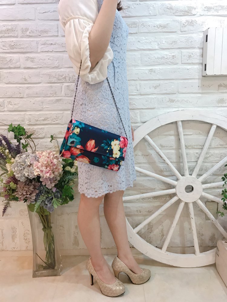 ネイビーのクラッチバッグ。カラフルは花柄がプリントされていてとても可愛いです。シンプルなドレスに合わせると華やかさとお洒落感をブラッシュアップ。チェーン付きの2way仕様なので、利用シーンによって持ち方を替えられるのも嬉しいポイントです。袱紗が入る大きさで、収納力もあり抜群の機能性。 結婚式や二次会、各種パーティなど華やかな場面にぴったりなバッグです。