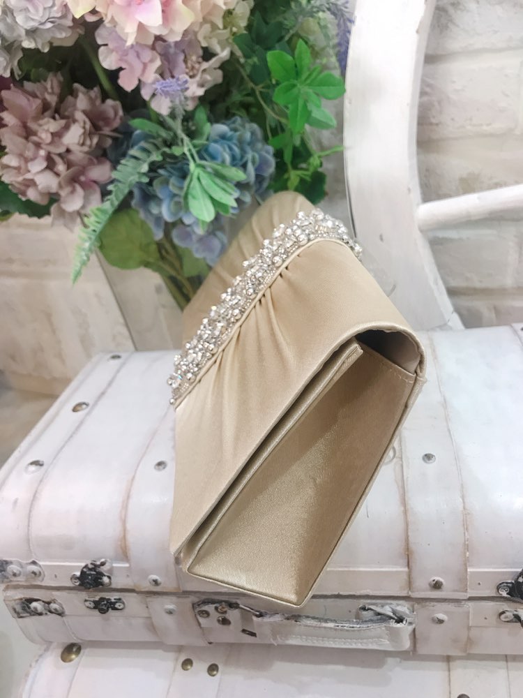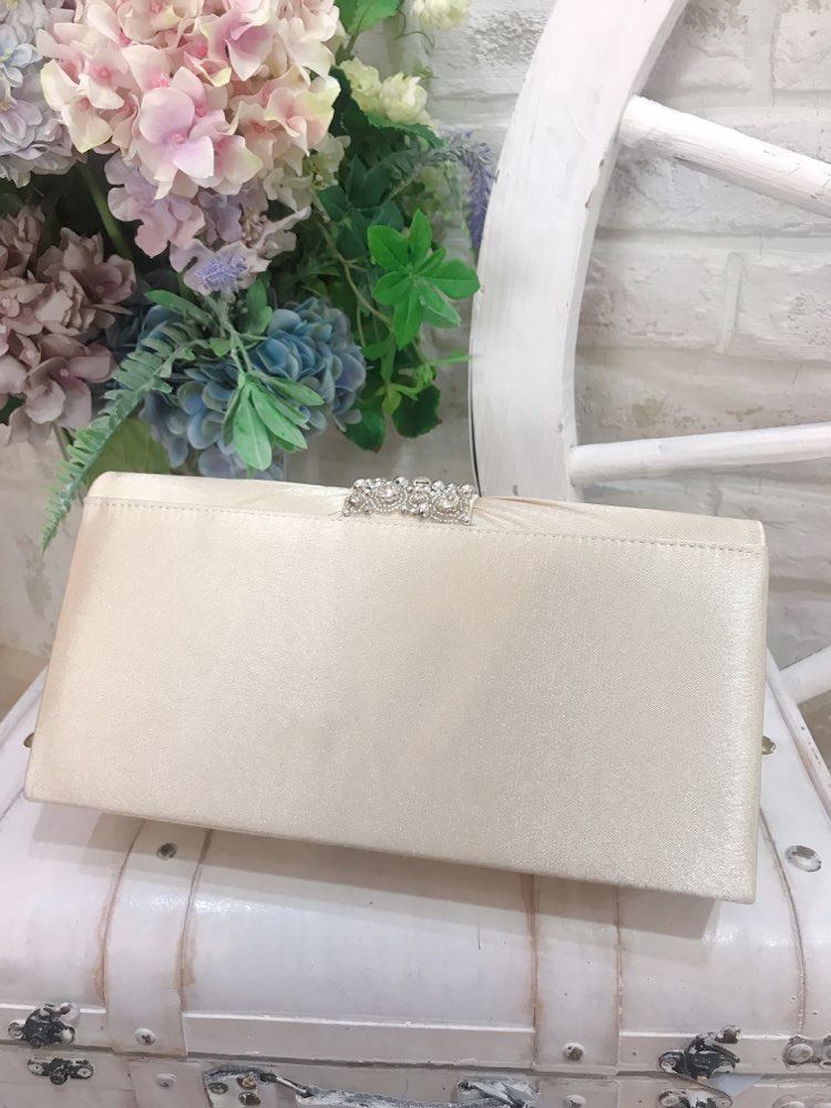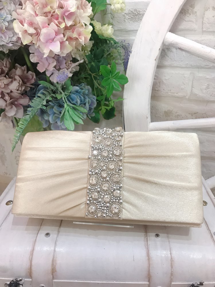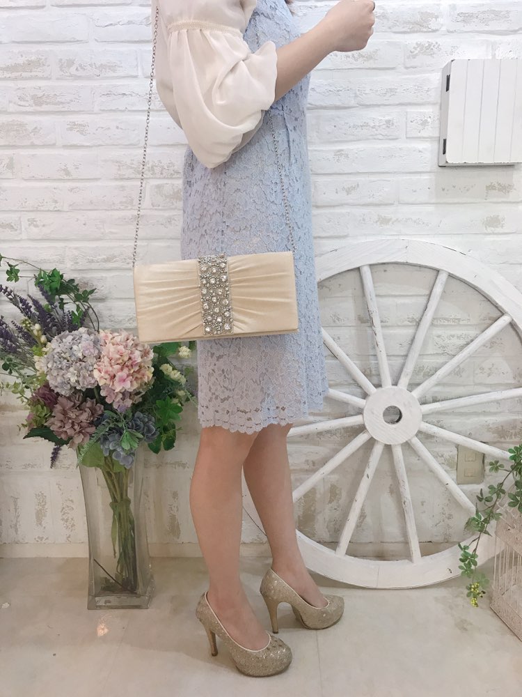シャンパンベージュのクラッチバッグ。真ん中にはビジューがあしらってあり華やかです。チェーン付きの2way仕様なので、利用シーンによって持ち方を替えられるのも嬉しいポイントです。袱紗が入る大きさで、収納力もあり抜群の機能性。結婚式や二次会、各種パーティなど華やかな場面にぴったりなバッグです。