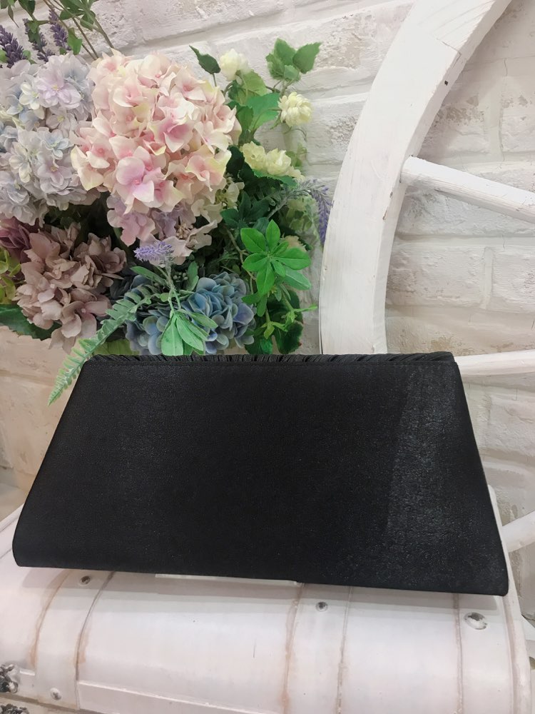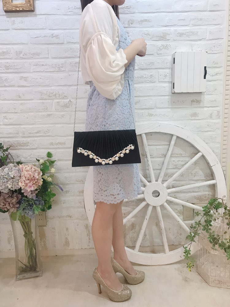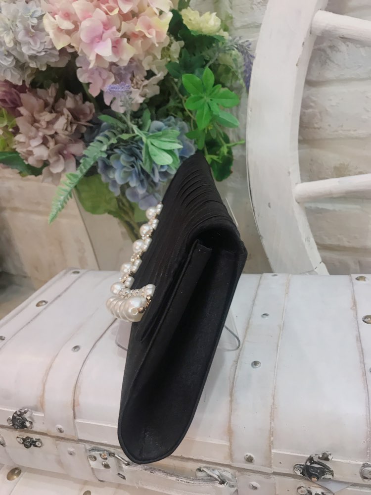 ブラック花形ビジュとパール付きプリーツクラッチバッグ