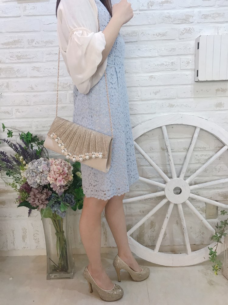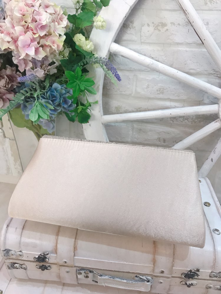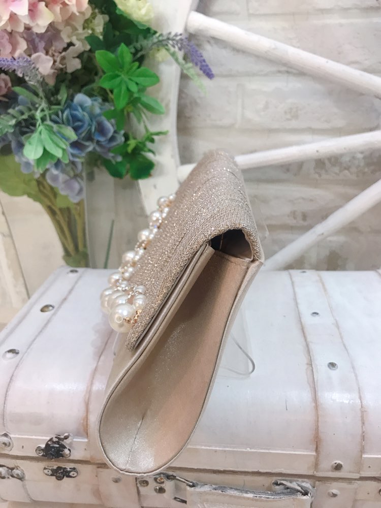 シャンパンベージュのクラッチバッグ。ラメ生地と2トーンカラーになっています。パールとビジュの装飾があしらってあり華やかです。チェーン付きの2way仕様なので、利用シーンによって持ち方を替えられるのも嬉しいポイントです。結婚式や二次会、各種パーティなど華やかな場面にぴったりなバッグです。