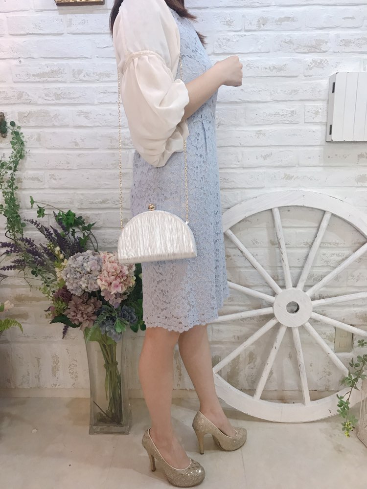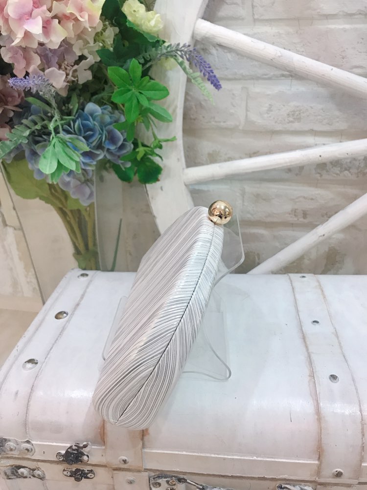 シャイニーホワイトクラッチバッグ。ラウンド型でおしゃれなバッグです。開け口のつまみの部分はゴールドとなっています。チェーン付きの2way仕様なので、利用シーンによって持ち方を替えられるのも嬉しいポイントです。結婚式や二次会、各種パーティなど華やかな場面にぴったりなバッグです。