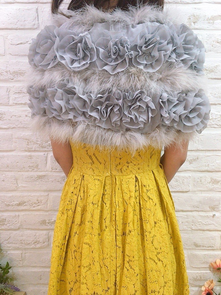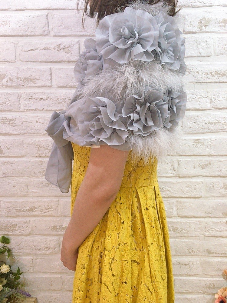 気品ある雰囲気にドレスアップを叶えるグレーファーストール。大きな薔薇と水鳥ファーがついているので華やかな印象になります。
