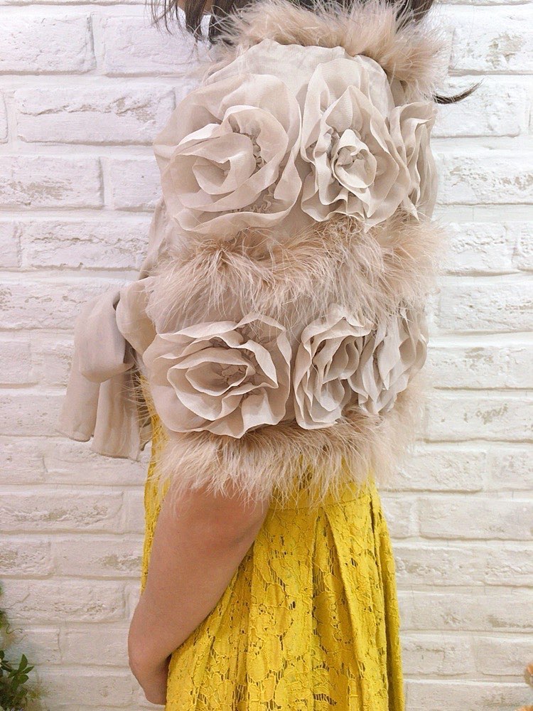 柔らかい生地に薔薇のモチーフと水鳥ファーがふんだんに付いてます